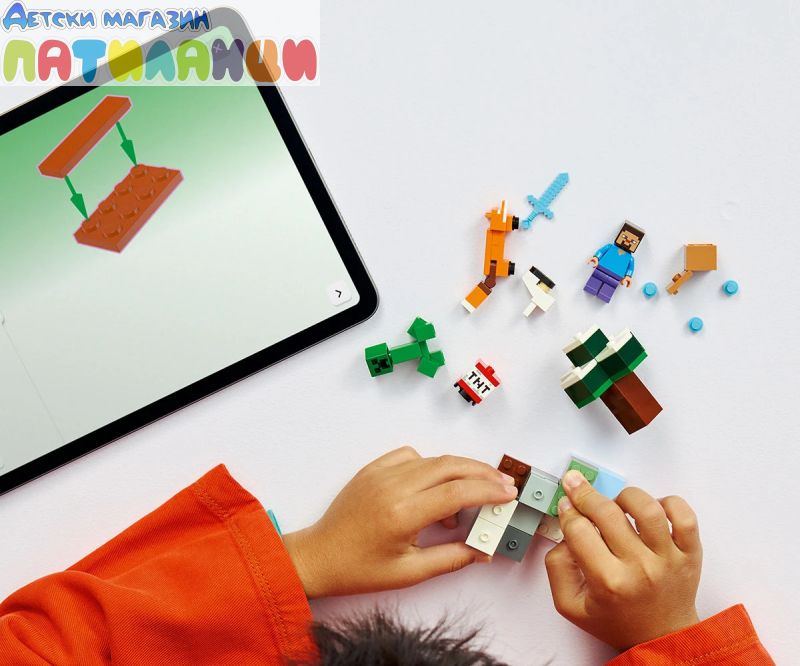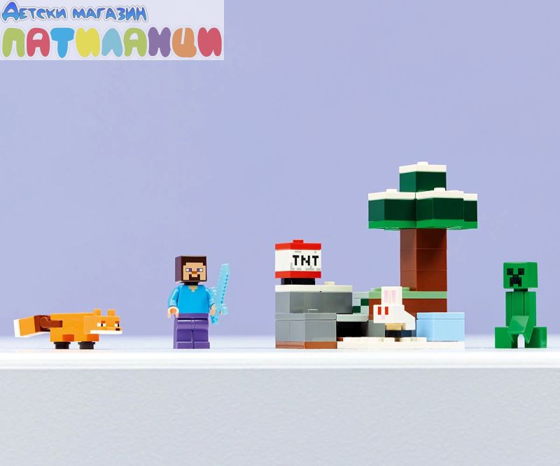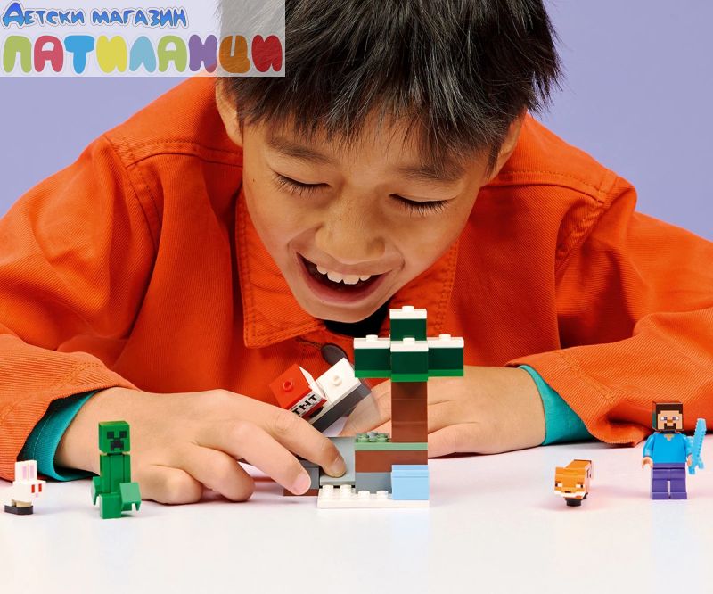 Пренесете играчите на Minecraft® на следващото ниво с „Приключението на Стив в тайгата“ (21583), колекционерски строителен комплект за момчета и момичета над 6 години. Този малък комплект LEGO® предлага боен екшън, лов на съкровища и експлозивно забавление, което децата да изследват с минифигура на Стив, плюс фигури LEGO на Creeper™, лисица и бебе зайче. Децата се присъединяват към един от героите от игрите - Стив, докато получава диаманти в биома на тайгата на Minecraft с различни смърч, сняг и трева. TNT и функция за експлозия разрушават скалите, за да разкрият диаманти, които могат да се съхраняват в сандък със съкровища. Има и враждебен Creeper, с който да се борите с диамантения меч на Стив. Този комплект е чудесна идея за подарък за играчи на Minecraft, конструктори с LEGO и фенове на геймърските декорации. А с приложението LEGO Builder децата могат да строят уверено – да компютърират, да завъртат в 3D и да проследяват напредъка с лесни за следващи цифрови инструкции. Влезте в биома на тайгата със Стив, за да търсите скритите диаманти под замръзналия смърч! Използвайте TNT, за да взривите скалата, а след това приберете диамантите си в сандъка за съкровища. Но внимавайте – близо до крие Creeper™. Вземете диамантения си меч и защитите съкровището си в това изпълнено с екшън приключение от Minecraft®!