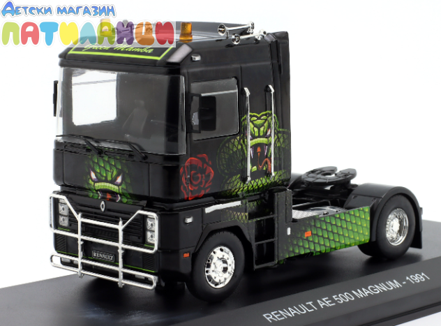 Колекционерски метален модел на емблематичния Renault AE 500 Magnum Truck от 1991 г. – камион, който бележи нова ера в дизайна и комфорта на европейските влекачи. Моделът е част от колекционната серия на Hachette и е предназначен за ценители на класически камиони и прецизни die-cast реплики.