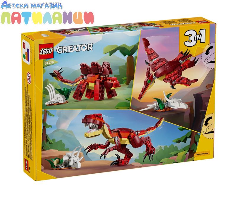 Този строителен комплект LEGO® Creator „3 в 1“ Свиреп динозавър (31379) дава на децата над 8 години всичко, от което се нуждаят, за да се насладят на безкрайни праисторически приключения. Тази страховита и детайлна играчка с динозаври предлага 3 различни възможности за построяване с един и същ комплект тухлички. Момчетата и момичетата могат да изберат да построят играчка велоцираптор с подвижна челюст, глава, ръце, крака и опашка. След това той може да бъде превърнат в играчка стегозавър, която може да движи вратата, главата и краката си, или птерозавър с подвижни крила, глава и крака. Всеки модел се предлага и с череп и гръден кош, яйца на динозаври и растение. След играта всеки модел може да бъде изложен на показ като динозавърска украса на стаята, която момчетата и момичетата да споделят със семейството си. Този комплект LEGO Creator „3 в 1“ ще вдъхнови въображението на децата и е страхотен динозавърски подарък. А с приложението LEGO Builder децата могат да се насладят на страхотно строително приключение. Можете да сработите и да завъртите комплектите си с помощта на 3D инструкции и да проследявате напредъка си. Моделите не могат да бъдат построени едновременно. Върнете се в праисторически времена за приключения с 3 различни свирепи динозаври! Отидете на лов със страшен велоцираптор до череп и гръден кош на динозавър. След това го превключете в стегозавъра, който може да движи вратата, главата и краката си, или в птерозавъра, за да лети през небето. Какво ще построите? Изборът е вашият с този невероятен комплект за игра „3 в 1“.