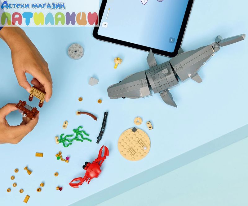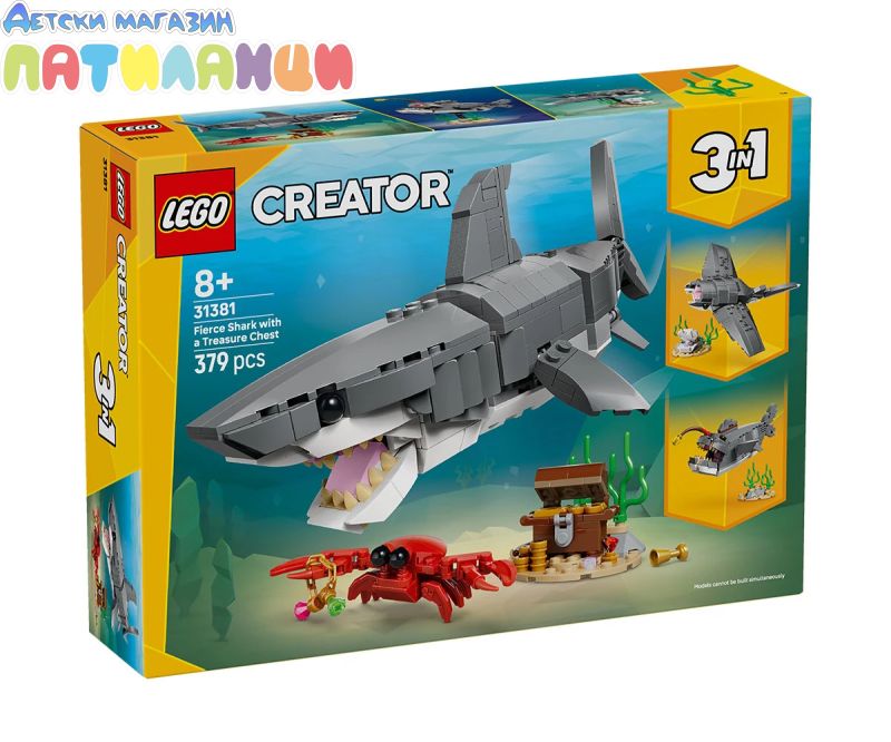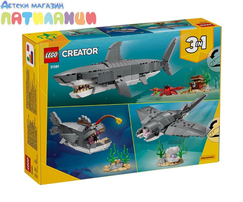 Момчетата и момичетата на възраст над 8 години могат да разиграват забавни подводни истории със строителната играчка LEGO® Creator „3 в 1“ Свирепа акула със сандък със съкровище (31381). Този впечатляващ комплект с морски животни предлага на децата 3 различни възможности за построяване с един и същ комплект тухлички. Те могат да изберат да построят подвижна акула, която може да бъде изложена на стойка със сандък със съкровище и рак. След това мога да превърна в морски дявол на стойка с морски растения или подвижен скат на стойка с мидена черупка. След като включва със строителството и забавлението по време на игра, всеки модел може да бъде изложен като украса на стаята на рафт или бюро. Този комплект LEGO Creator „3 в 1“ ще вдъхнови младото въображение и е чудесна идея за подарък за деца, които обичат морски животни. А с приложението LEGO Builder можете да се насладите и да направите строително приключение. Можете да сработите и завъртите комплектите си с помощта на 3D инструкции за построяване, да проследявате напредъка си и да запазите комплектите на едно място. Моделите не могат да бъдат построени едновременно. Гмурнете се до дъното на океана за забавни приключения с 3 морски животни LEGO®! Помогнете на акулата да пази сандъка със съкровището от досаден рак. След това се превръщам в риба морски дявол, който може да движи устата и перките си, или в риба скат с мидена черупка. Какво ще построите? Изборът е вашият с този супер страхотен комплект за игра „3 в 1“ с фигури от океана.