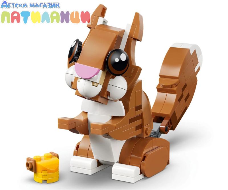 Строителният комплект LEGO® Creator "3 в 1" Сладки животни: игриво кученце (31382) позволява на децата на възраст над 8 години да разиграват забавни истории. Тази сладка играчка с животни за момичета и момчета предлага 3 различни възможности за построяване с един и същ комплект тухлички. Децата може да изберат да построят куче с подвижна глава, уши, лапи, опашка, вежди и муцунка, което има нашийник, кост-играчка и купа за вода. То може да бъде превърнато в катерица с подвижна глава и опашка, която държи жълд, или в патица с подвижна глава и езеро, изпълнено със зеленина. След като времето за игра приключи, всеки модел може да бъде гордо изложен на показ. Този комплект с животни "3 в 1" ще вдъхнови въображението на децата и е сладък подарък за момичета и момчето, които обичат игра наужким. Децата може да построи всеки комплект уверено с приложението LEGO Builder – да сбърка, да завърти в 3D и да проследи напредъка си с лесни за следващите цифрови инструкции. Моделите не могат да бъдат построени едновременно. Пригответе се да се насладите на забавни истории с 3 суперсладки животни от LEGO®! Играйте с дружелюбно кученце, докато дъвче кост-играчка и пие вода от купа. След това го превключете в катерица, която гризе жълд, или в патица край езеро. Какво ще построите? Изборът е вашият с този очарователен комплект за игра „3 в 1“ с животни.
