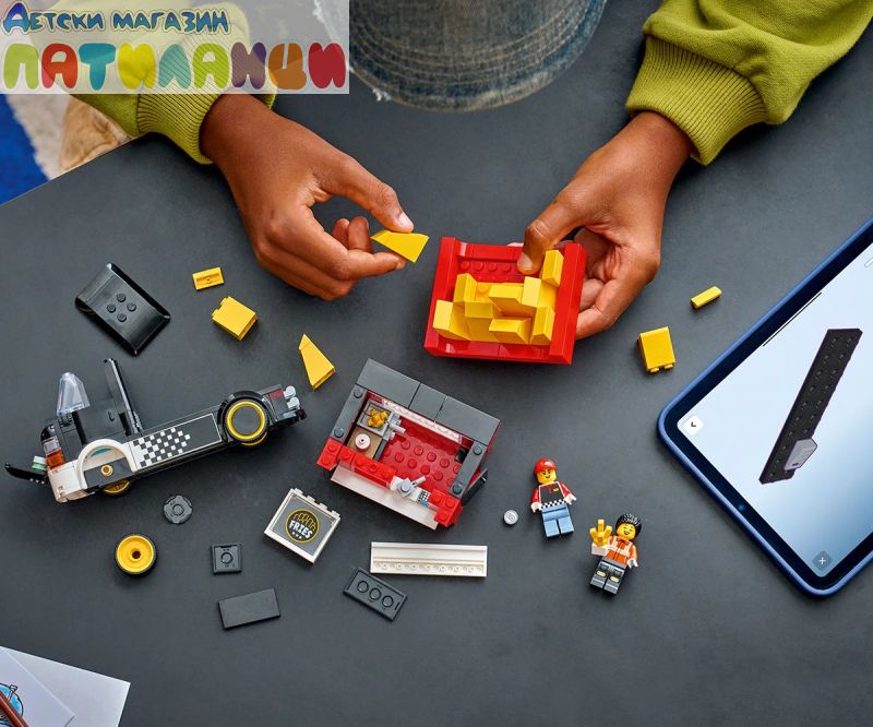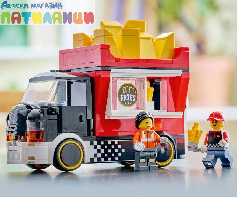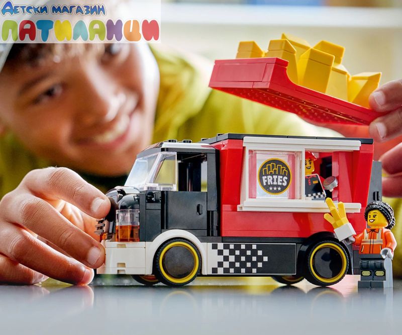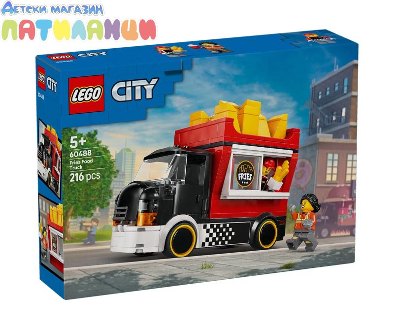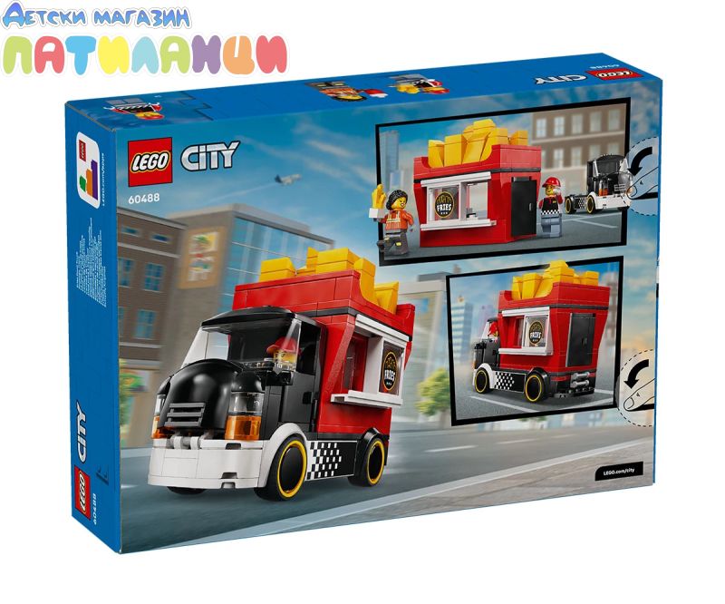 Сервирането на бърза храна е детска игра със строителен комплект LEGO® City Камион за пържени картофи (60488) за възраст над 5 години. Шареният камион за храна разполага с подвижен павилион с формат на гигантска картонена кутия. Децата може да махнат покрива, за да получи достъп до подробна зона за приготвяне на храна, оборудвана с фритюрник, подправки и плъзгащ се прозорец за обслужване. Този модел на камион за бързо хранене има и отварящ се капак с двигател-играчка и се предлага с минифигурки на продавач и клиент. Този комплект за игра с храна е чудесен подарък за 5-годишните момчета, момичета и деца, които обичат да строят с LEGO и да разказват истории с въображение. Добавете я към другите (продавате се отделно) от гамата LEGO City за приключения в целия град. Децата може да построи този камион за бързо хранене уверено с приложението LEGO Builder – където може да компютъризира, да завърти в 3D и да проследи напредъка си с лесни за следващи дигитални инструкции. Пътувайте из LEGO® City на борда на страхотния камион за пържени картофки! Изберете своя участък, паркирайте камиона и идете в зоната за приготвяне на храна. Запалете фритюрника, плъзнете прозореца и сервирайте най-горещата бърза храна в града от готиния и павилиона, който прилича на гигантска картонена кутия със златни пържени картофи. Уличната храна никога не е изглеждала толкова вкусна! Когато приключите, седнете зад волана и се отправете към следващото място!