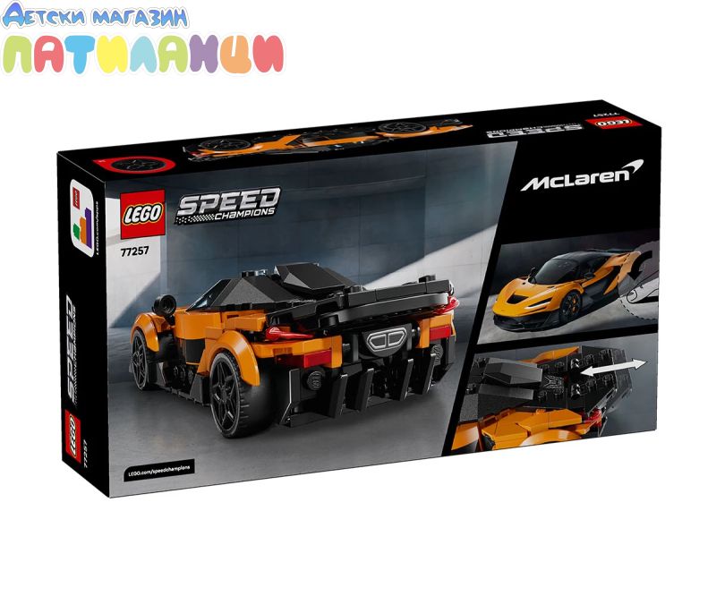 Високоскоростният екшън очаква момчето и момичето на възраст над 9 години с репликата LEGO® Speed Champions на McLaren W1 – истинската суперкола (77257). Децата строят, показват и се състезават със стилно състезателно кола, която включва множество известни детайли от дизайна в реалната версия, пусната на пазара за отбелязване на 50-тата годишна победа на McLaren в Световния шампионат на Формула 1®. Този модел на колата McLaren има регулируемо задно крило за пътуване или състезания, заден двигател, кокпит, екран за инфоразвлечения и въздухопроводи отстрани и отгоре. Състезателната кола-играчка включва и минифигура на пилот в екип на McLaren с шлем, перука и гаечен ключ, който може да се използва и за поставяне на стикери и отделни тухлички. Комплектите за конструиране LEGO Speed Champions са страховита идея за подарък за деца и им позволяват да сглобяват реплики на разширената гама емблематични превозни средства. Децата може да построи всеки комплект уверено с приложението LEGO Builder - да сбърка, да завърти в 3D и да проследява напредъка си с лесни за следващи дигитални инструкции. Отразувайте невероятната сила и конструирайте на истинската суперкола – McLaren W1, като построите своя собствена версия LEGO®! Тази реплика на Speed Champions включва много от дизайнерските детайли на реалния модел, включително регулируемо задно крило за пътуване или състезания и екран за информативност. Комплектът за игра включва и минифигура на McLaren, която да поставите зад волана за състезания.