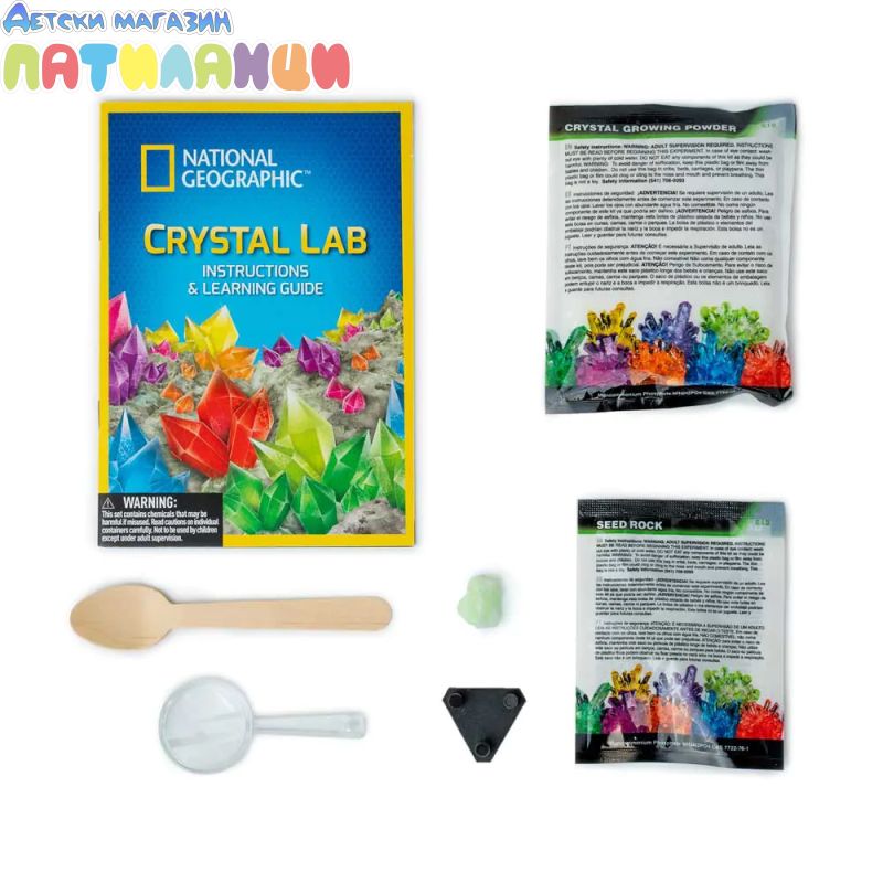 Комплектът съдържа всичко необходимо за провеждане на експеримента – специална смес за отглеждане на кристали, основа (семе), съд за растеж и подробно илюстрирано ръководство. Включен е и истински минерален образец, който допълва научното изживяване и насърчава интереса към геологията.