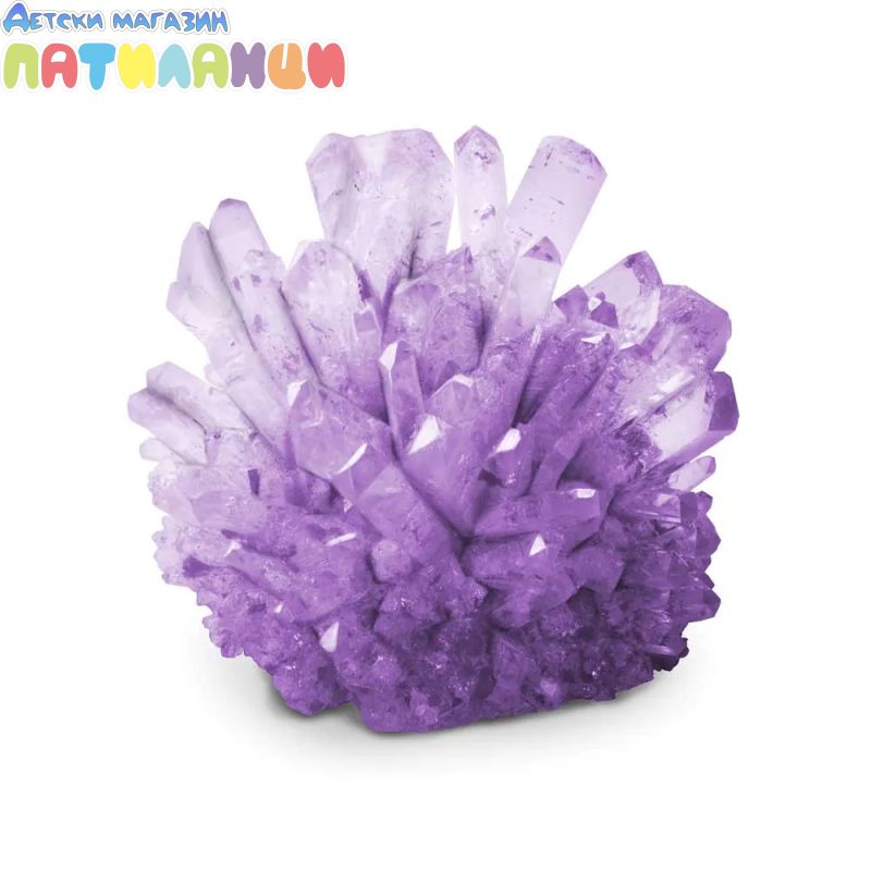 Комплектът включва всичко необходимо за експеримента: прах за отглеждане на кристали, основа, учебно ръководство с лесни за следване инструкции, бъркалка и истински аметистен образец, за да могат децата да сравняват своите кристали с естествения минерал. Готовият кристал може да се изложи на поставката, включена в комплекта, за да се радвате на резултата.