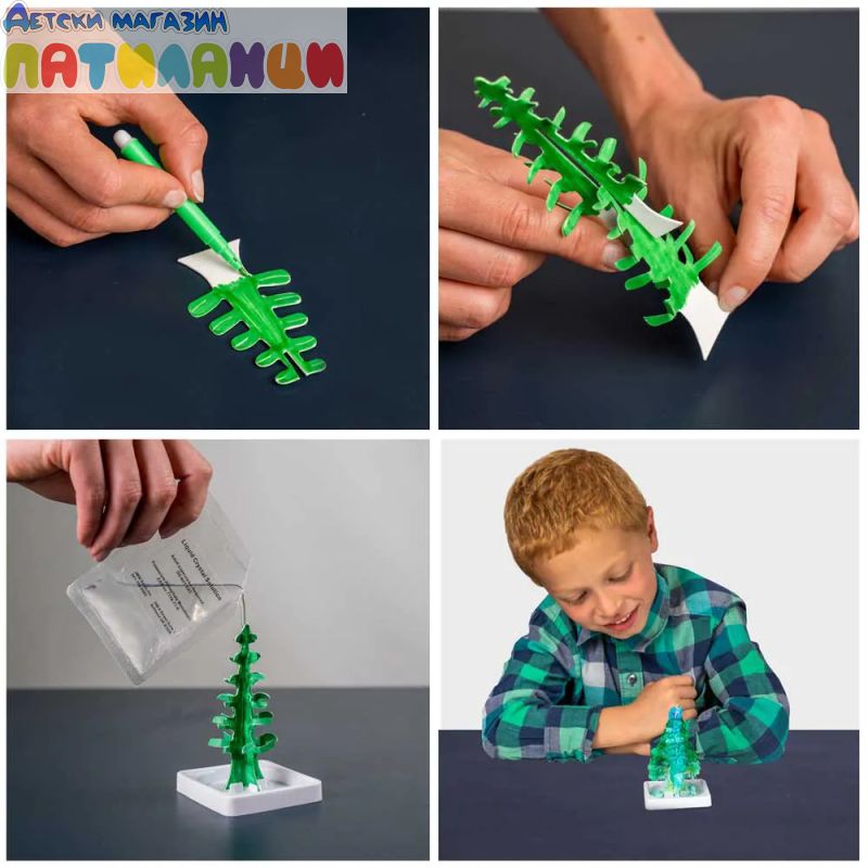 Комплектът включва всичко необходимо за експеримента: специален прах за кристали, поставка, учебно ръководство с лесни за следване инструкции и инструменти за безопасна работа. След като кристалите се оформят, те могат да се изложат на включената поставка и да се създаде истинска „кристална градина“.
