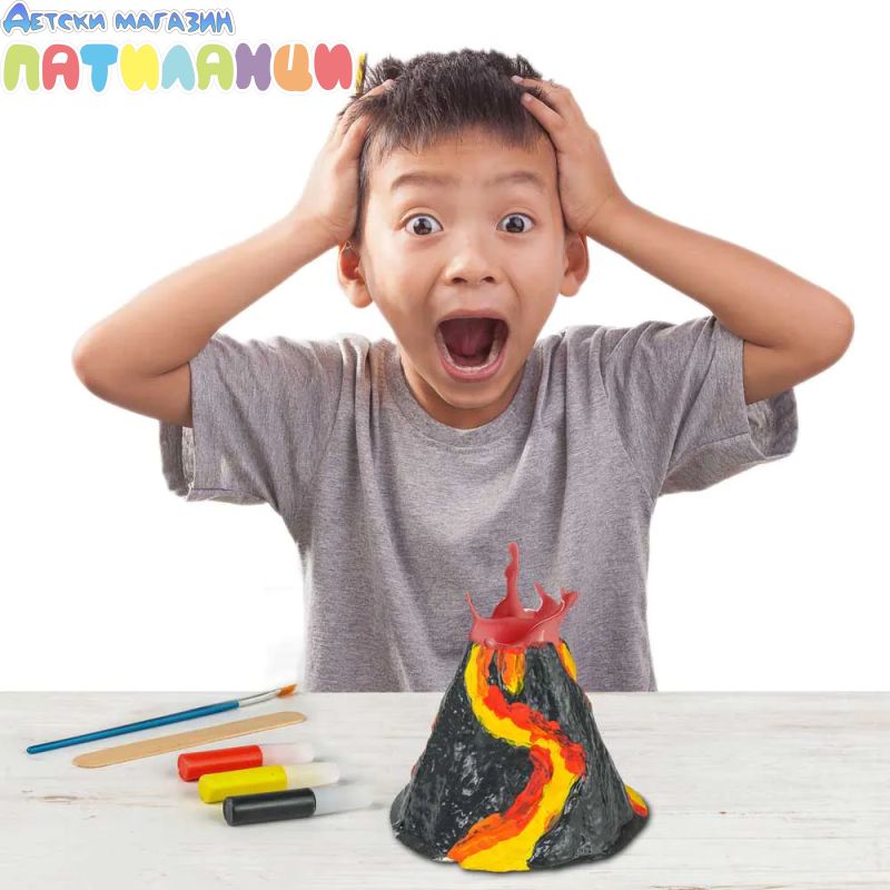 Включва: форма за вулкан, цветни добавки, ръководство за експерименти