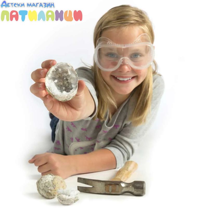 В комплекта са включени 2 натурални геоди, които трябва да бъдат внимателно разчупени, за да се разкрият уникалните кристални образувания вътре. Всяка геода е различна, което прави изживяването още по-интересно и неповторимо.