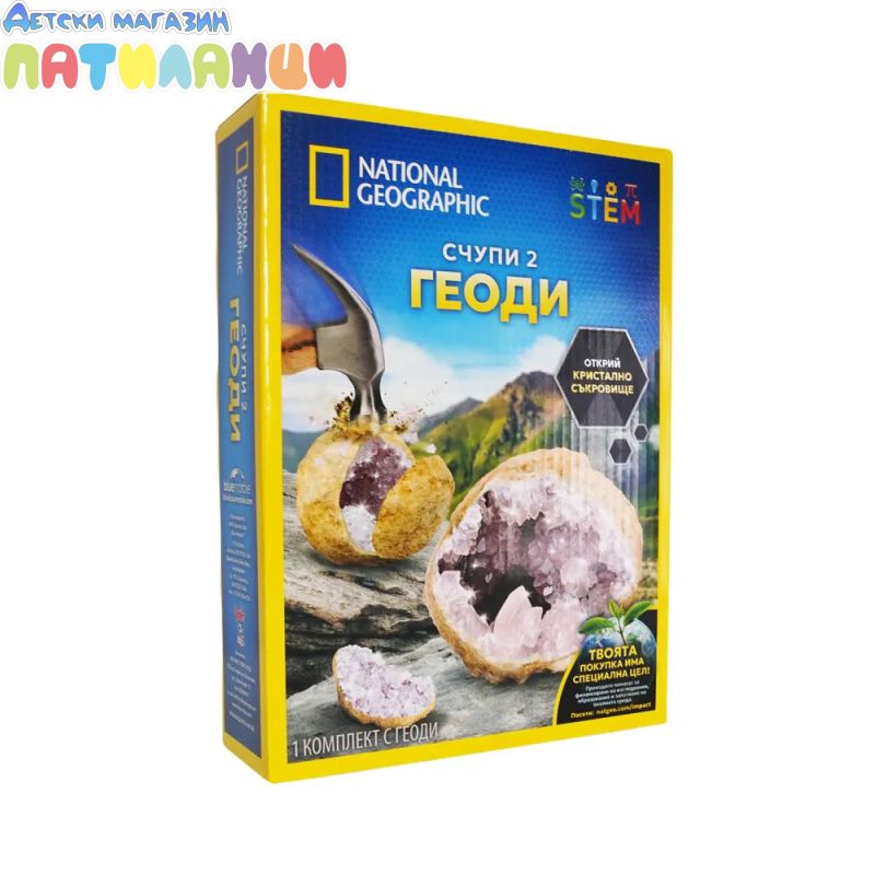 Открийте тайните, скрити в камъка, с комплекта „Счупи 2 броя геоди“ от National Geographic! Този вълнуващ образователен комплект дава възможност на децата сами да разкрият красивите кристали, скрити във вътрешността на истински геоди.