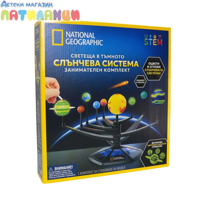 Открийте чудесата на космоса с Светещата в тъмното Слънчева система от National Geographic – образователен и забавен комплект, който позволява на децата да научат планетите, звездите и астрономическите явления по интерактивен начин! 🌌