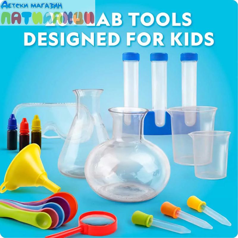 Комплектът включва и над 20 подходящи за деца лабораторни инструменти, предназначени за малки ръце, които позволяват на децата да се чувстват като истински учени, докато измерват, смесват и наблюдават експериментите си. От бехери и епруветки до предпазни очила, този комплект съдържа всичко необходимо за истинско лабораторно преживяване.