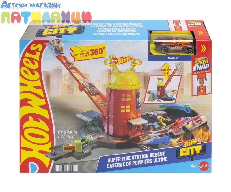 Hot Wheels City - Пожарна Игралният комплект Hot Wheels City Пожарна вдъхновява креативно разказване на истории и приключения с колички Hot Wheels. Влезте с колата в навеса и разгънете пожарникарската стълба, за да създадете гравитационно спускане от около 40 см. Изберете един от четири различни изхода: профучете през светофар с флипер, преодолейте скок, за да изгасите пожара, посетете хидранта и водния маркич, за да презаредите, или потеглете към новата мисия, за да спасите деня. Пожарната станция се върти на 360°, така че сами да избирате пътя на децата. Основата разполага с точки за свързване на Speed Snap Track System за свободна и разширяваща се игра. Включена е 1 пожарна кола Hot Wheels в грешка 1:64. Цветовете и декорациите могат да варират.