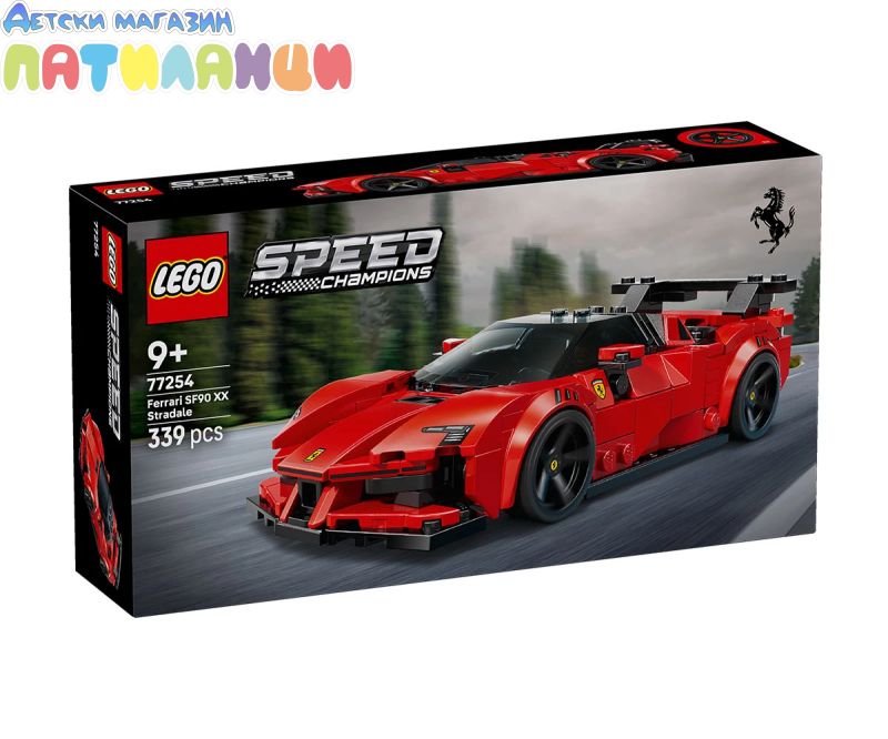Разгледайте мощната и усъвършенстваната технология на спортната кола Ferrari SF90 XX Stradale със собствената си версия LEGO®! Колекционирайте, постройте, покажете и се състезавайте с този модел реплика от Speed Champions, включваща автентични детайли на реалния модел. Комплектът за игра включва и минифигура, която да поставите зад волана. Момчето и момичето на възраст над 9 години могат да построят, да покажат и да играят с този стил LEGO® Speed Champions Спортна кола Ferrari SF90 XX Stradale (77254). Моделът на колата Ferrari включва много от детайлите на дизайна от реалната версия – най-мощната пускана в експлоатация кола на Ferrari. Тази кола-играчка на Ferrari е с преден дизайн на кабината, задно крило, високи ауспуси и джанти, украсени с щита на Ferrari. Комплектът с модела на колата включва и минифигура на шофьор, облечен в екип на Ferrari и с шлем, който да постави в едноместния кокпит, за да могат децата да покажат и изразят страстта си към италианския автомобилен производител. Комплектът LEGO Speed Champions е страхотна идея за подарък за деца, като им позволява да сглобяват реплики на разширената гама емблематични превозни средства. Децата може да създаде уверено всеки комплект с приложението LEGO Builder, който им позволява да увреди, да завърти в 3D и да проследи напредъка си с лесни за следващи дигитални инструкции. Комплектът съдържа 339 части.