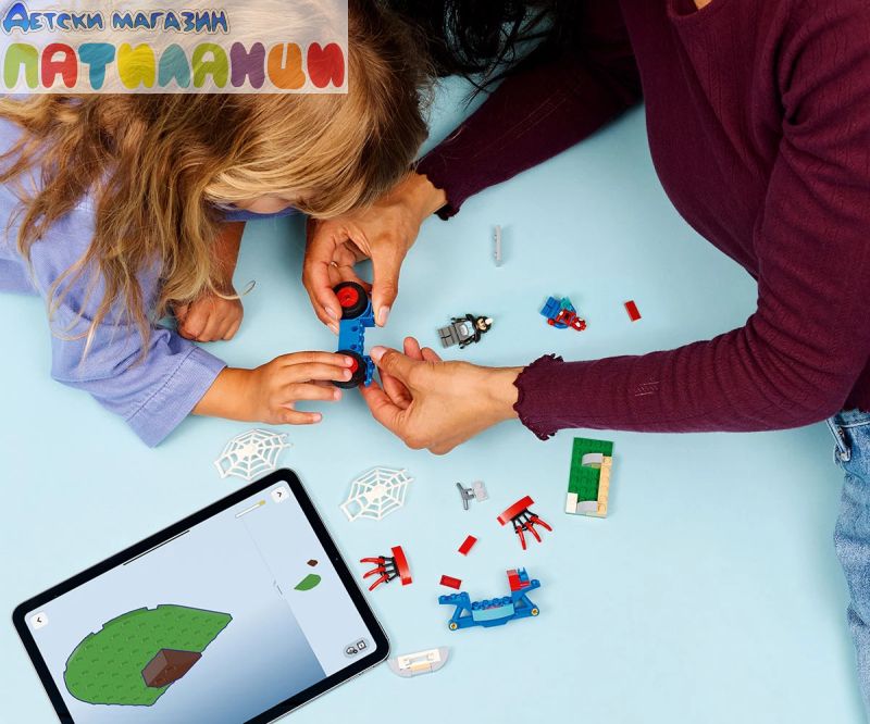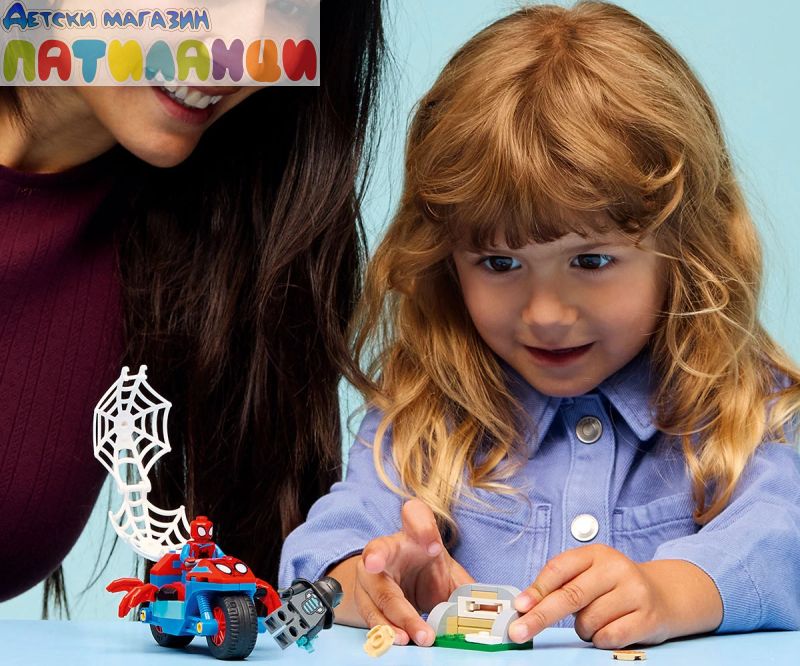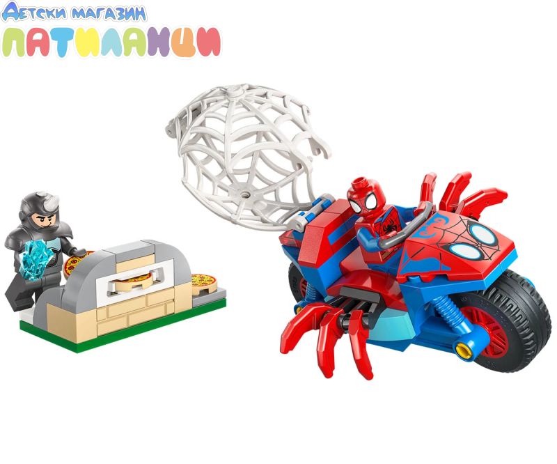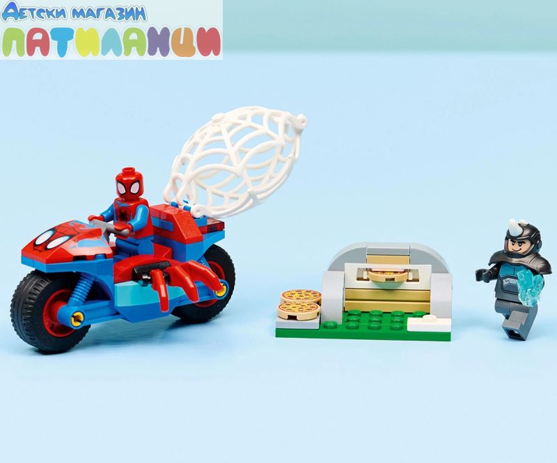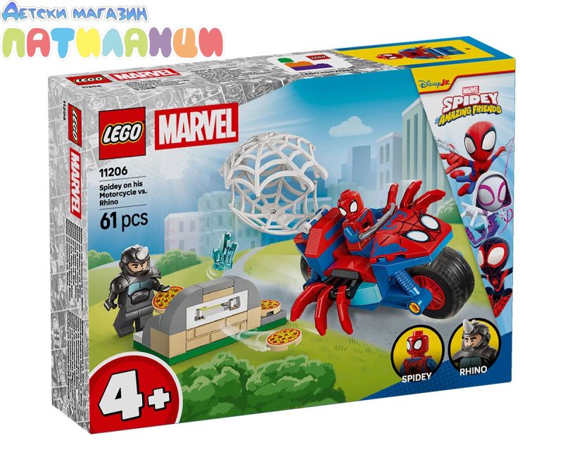 С този Спайди на мотоциклет срещу Носорога (11206) екшънът със супергероите е в ръцете на децата, а играчът за построяване е за момчето и момичето на възраст над 4 години. С минифигурки на Спайди и Носорога и мотоциклет с форма на паяк, този строителен комплект със Спайди е чудесен начин да помогнете на децата да развият творческите си умения. Децата помага на Спайди да вземе откраднат син скъп оценен камък, да избегне летящите пици, изстреляни от оръдието на песента за пица на Носорога, и да залови Носорога в гигантски капан с паяжина – който също се побира в мотоциклета. Проектиран с мисъл за начинаещи строители, този строителен комплект е пълен с детайли, за да вдъхнови децата за безкрайна въображаема игра. Това е чудесен подарък за рожден ден или друг повод за феновете на Spidey And His Amazing Friends. Предлага се с цветни инструкции с картинки, големи начални тухлички и отделни торбички, съдържащи по 1 модел за конструиране в торбичка, за да се направи конструирането бързо и приятно. А с приложението LEGO Builder децата могат да строят уверено – да компютърират, да завъртат в 3D и да проследяват напредъка си с лесни за следващи дигитални инструкции. Носорога е откраднал лъскав син скъпоценен камък. Скочете на страхотния суперспайдърски мотор на Спайди и се впуснете в ексшън. Внимавайте – Носорога стреля с летящи пици от своето пица-оръдие! Хванете злодея в гигантска мрежа, закопчайте го на гърба на мотора си, след което карайте, като носите скъпоценния камък, заплетена в мрежата носорог и вкусната пица!