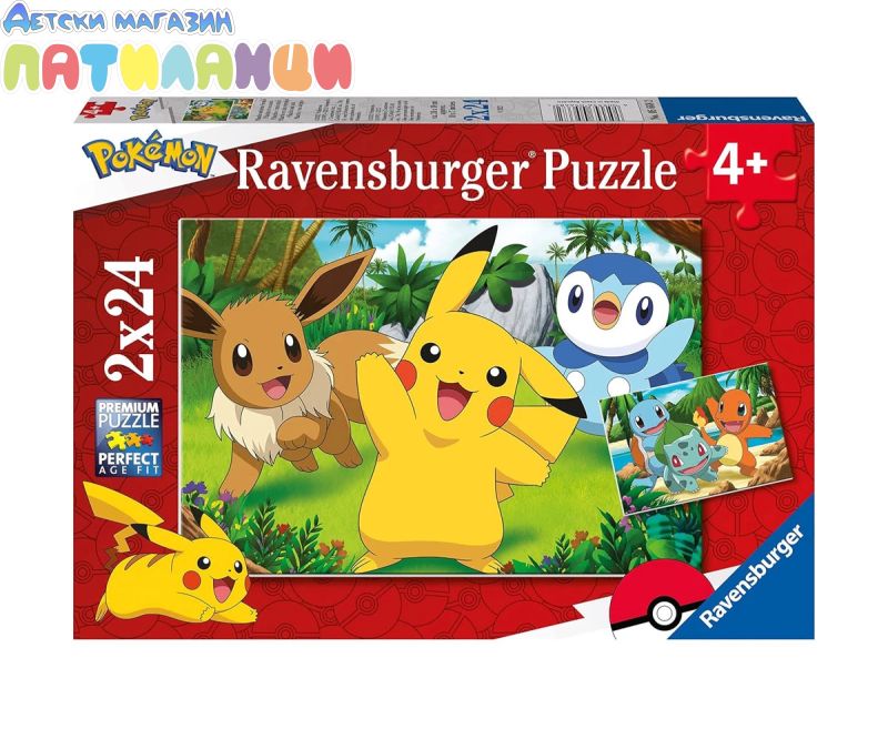 Тези два ярки и цветни пъзела от по 24 части са страховита покупка за всеки фен на Pokemon. Включват любими герои като Пикачу, Ийви, Булбазавър, Скуиртъл, Чармандър и Пиплъп. Детски пъзели 2x24 части са изработени от висококачествени материали и са с размер 26 x 18 см, когато са сглобени. Чудесни са за деца на възраст 4+ години. Пъзелите на Ravensburger са произведени с високо качество на изработка и се използват материали от устойчиво горско стопанство. Те са педагогически ценни, като съчетават играта, учението и развитието на концентрацията, търпението и увереността у децата. Подреждането на пъзелите учи децата да се опитват, комбинират и създават цялостна картина, изпитвайки радост от всеки нов успех. С правилно подбраната трудност, пъзелите помагат на децата да изграждат умения, търпение и самочувствие, докато се забавляват. Ravensburger 2x24 части - двойно забавление, двойно учене и двойна радост за всички малки любители на пъзели!