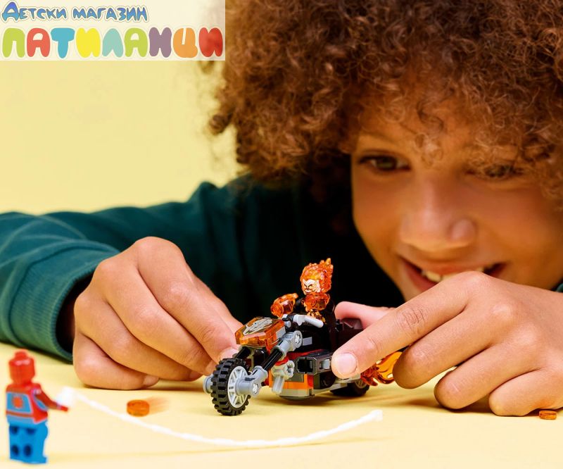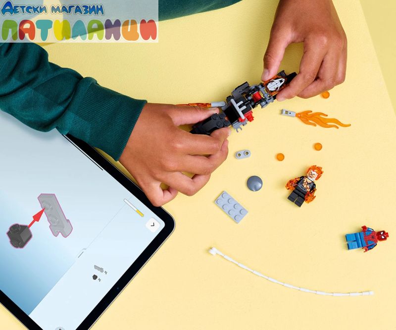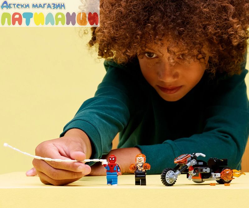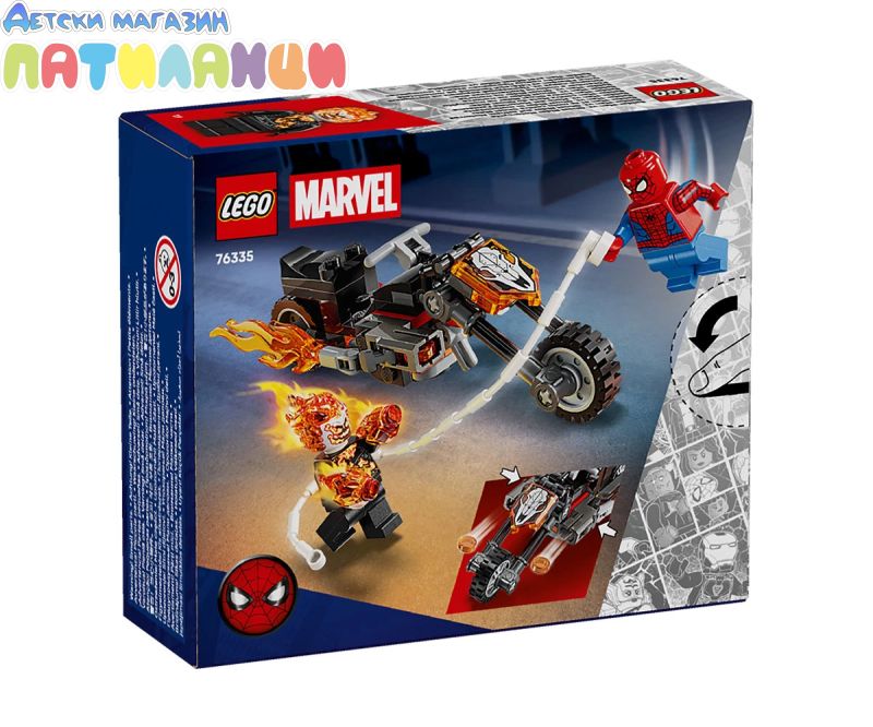 Дайте началото на супергеройски екшън със скоростно преследване с тази играчка за построяване „Спайдърмен срещу Призрачен ездач с мотоциклет“ (76335) за момчета и момичета на възраст над 6 години. Строителният комплект LEGO® ǀ Marvel с готова за битка мотоциклет и две динамични минифигурки на Спайдърмен и Призрачен ездач Специална игра с въображение на децата. Минифигурата на Призрачния ездач е изобразена като скелет с пламъци, излизащи от ръцете и главата му. Неговият емблематичен мотоциклет включва два пламтящи ауспуха и две вградени оръдия. Въжето от паяжината на минифигурата на Спайдърмен се прикрепя към мотоциклета и предлага безкрайни възможности за ролева игра, докато героите се бият с високоскоростното превозно средство. Този строителен комплект е чудесна идея за подарък за рожден ден за малки супергерои, конструктори с LEGO и фенове на колекционерските продукти със Спайдърмен. А с приложението LEGO Builder децата могат да строят уверено – да компютърират, да завъртат в 3D и да проследяват напредъка с лесни за следващи цифрови инструкции. Призрачният ездач фучи по улиците на мотоциклета си, а от ауспуха избухват пламъци! Когато Спайдърмен пристигне на своето въже и скача на огнения мотоциклет, започва екшън с паяжини, пламъци и оръдия!