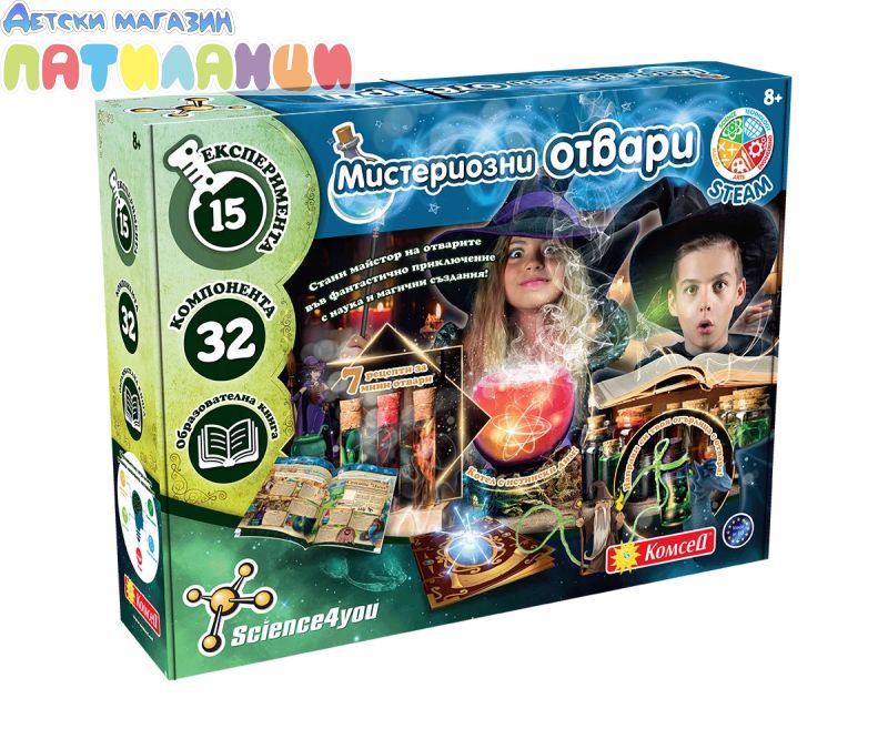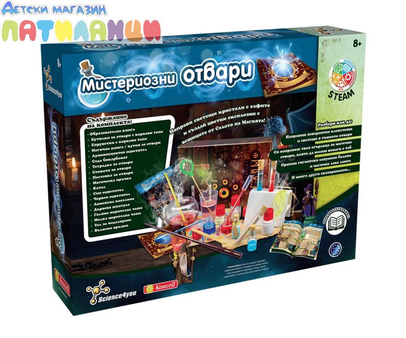 Стани майстор на отворите във фантастично приключение с наука и магични създания! Направи светещи кристали с елфите и създай цветни експлозии с вещиците от Селото на Магията! Мистериозни отвари е новата играчка от Science4you! Присъединете се към този фантастичен свят и научете как да правите бълбукащи или светещи в тъмното отвари, заедно с няколко магически същества и много наука! С тази играчка децата ще опознаят Магическото село, мистично място, където магията става реалност. Тук те ще срещне Майстор Смарт, най-опитният магьосник в града, и други магически същества (феи, вещици, гоблини, гиганти, дракони и русалки), които ще научат новия магьосник на най-добрите магически отвари. В комплекта е включена магическа пръчка и котел за приготвяне на отвари.