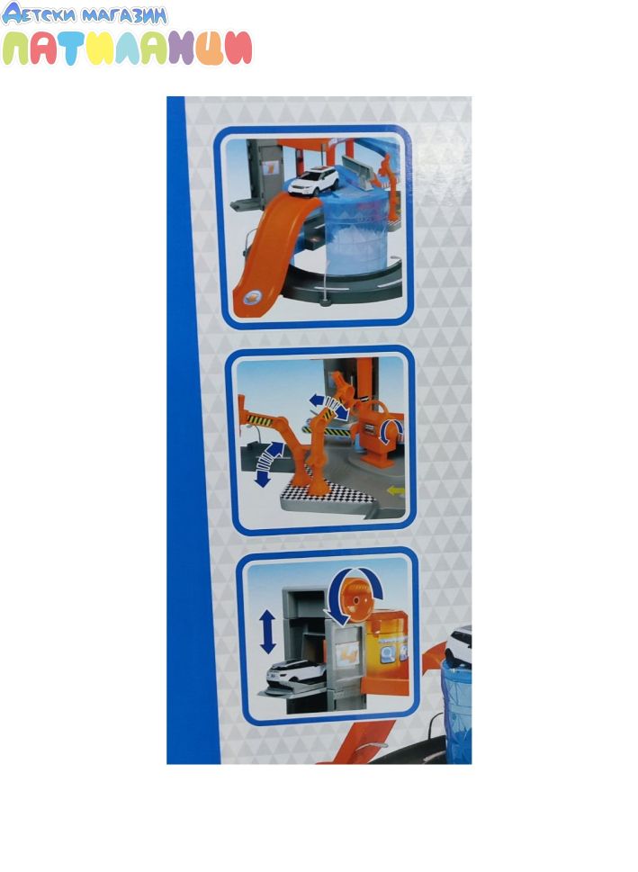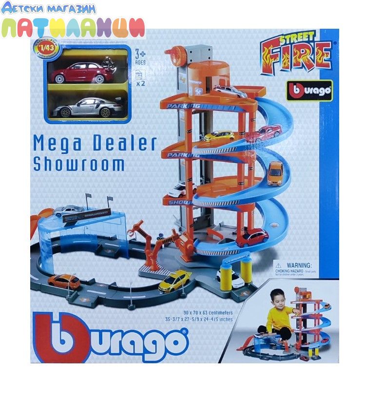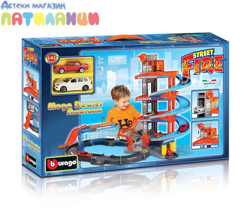 Комплектът включва гараж на три нива "Street Fire" с 2 колички с мащаб 1:43, подвижен асансьор за коли, вдигащи се бариери, автомивка, изложбено пространство, осветление и колонка за гориво.