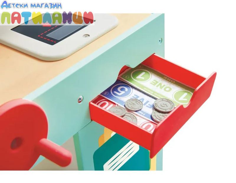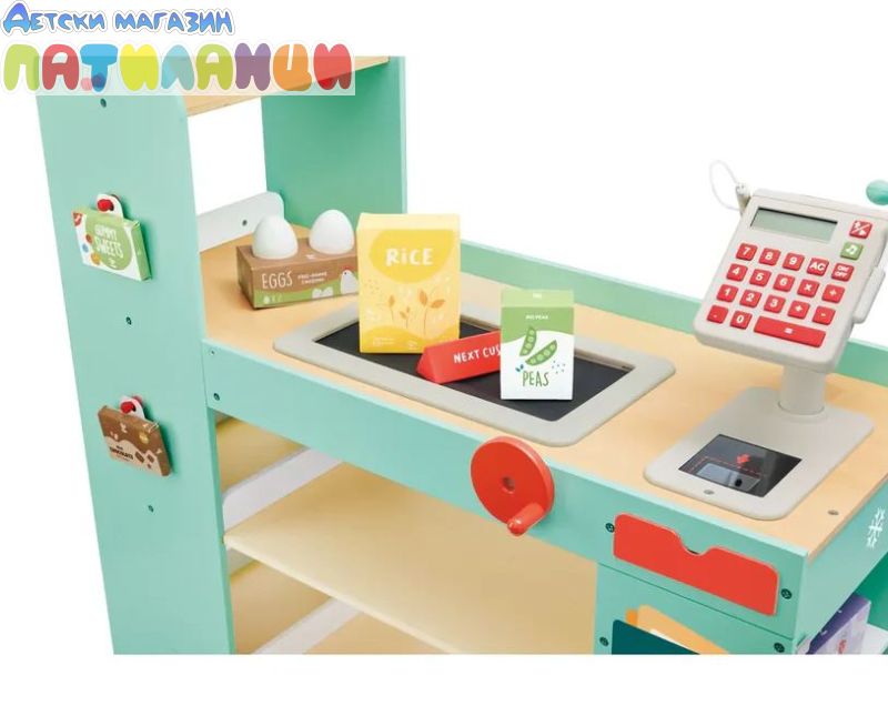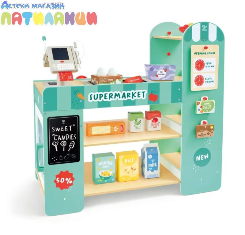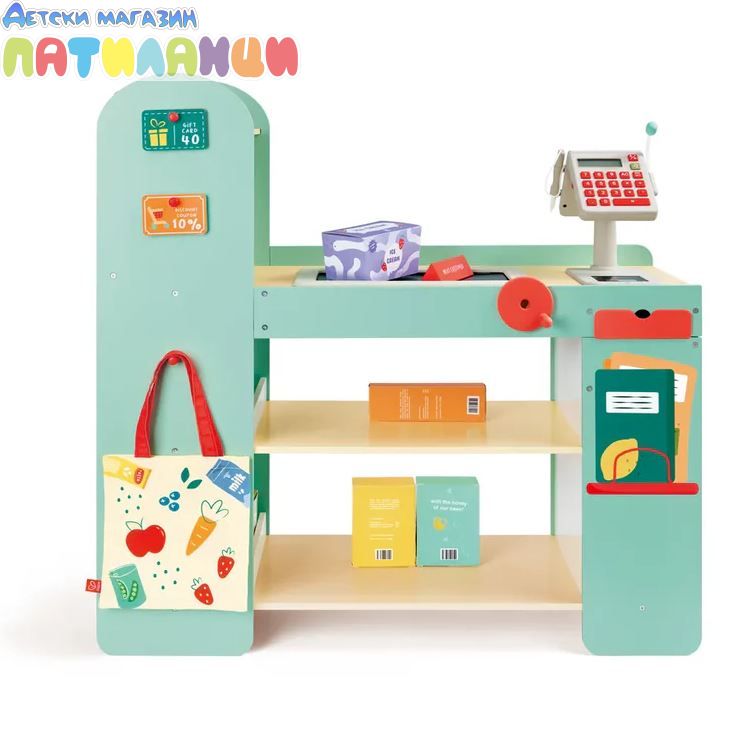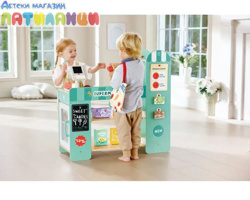 Комплектът включва магазин с щандове, каса и 50 различни аксесоара – продукти, касови бележки, пари и други елементи за игра. Малчуганите могат да пресъздават реалистични сценарии на пазаруване, като играят ролята на касиер или клиент.