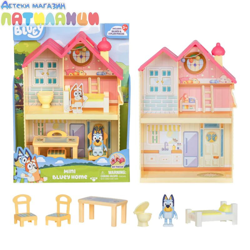 Къщата на Блуи с фигурка Bluey е пакет играчки, вдъхновен от популярния анимационен герой Bluey, който насърчава въображението, ролевата игра и креативното забавление. Комплектът включва детайлна мини къща и фигурка на Bluey, готови за многобройни приключения и сценки.