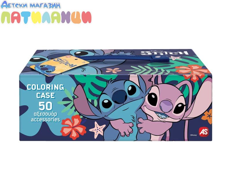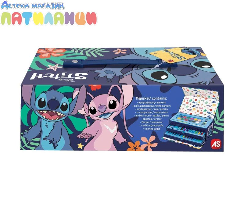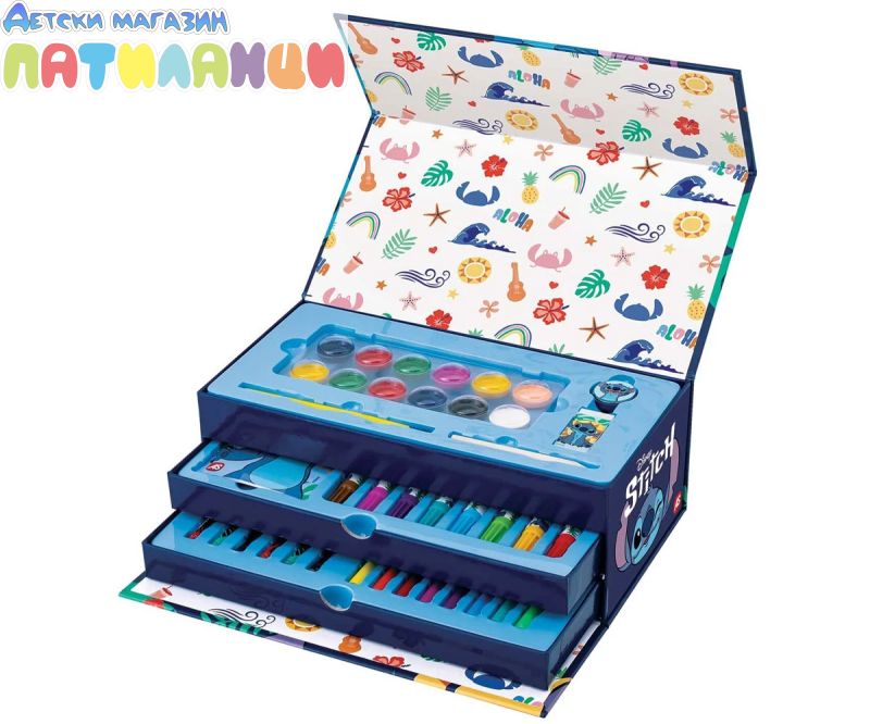 Стич творчески комплект - 50 аксесоара за рисуване в удобно куфарче. Потопи се във фантастичния свят на любимия герой Стич с този творчески комплект от 50 части! Всичко необходимо, за да оживеят любимите ти сцени чрез рисуване и оцветяване. Идеален за малки художници, комплектът е подреден в практично куфарче с дръжка и 3 нива, което позволява лесно пренасяне и удобно съхранение - за безкрайно забавление у дома или навън.