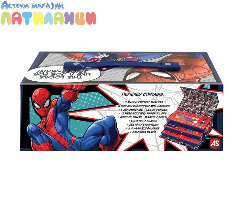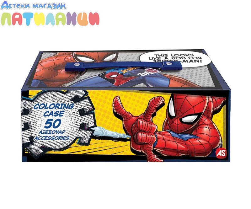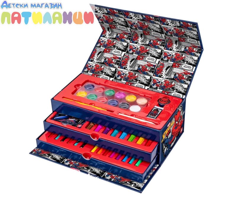 Спайдърмен творчески комплект - 50 аксесоара за рисуване в удобно куфарче. Потопи се във фантастичния свят на любимия герой Спайдърмен с този творчески комплект от 50 части! Всичко необходимо, за да оживеят любимите ти сцени чрез рисуване и оцветяване. Идеален за малки художници, комплектът е подреден в практично куфарче с дръжка и 3 нива, което позволява лесно пренасяне и удобно съхранение - за безкрайно забавление у дома или навън.