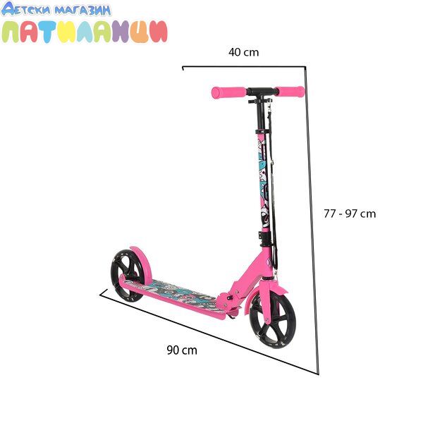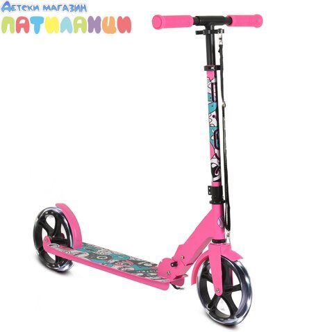 Тротинетката разполага със сгъваем механизъм, който позволява лесно пренасяне и съхранение. Регулируемото кормило може да се настройва според височината на детето, а стабилната платформа и издръжливите колела осигуряват добро сцепление и стабилност по време на каране.