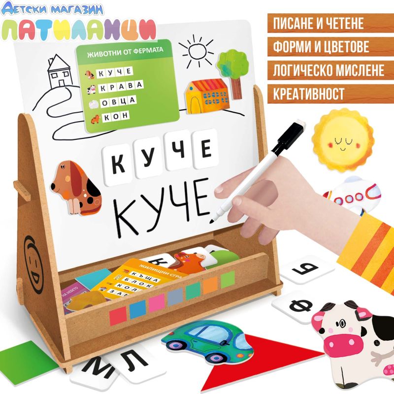 Образователен комплект, който съчетава игра и учене чрез интерактивна магнитна дървена дъска. С помощта на множеството магнити, букви и фигури децата могат да създават думи, да подреждат форми и да развиват своето въображение.