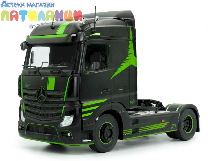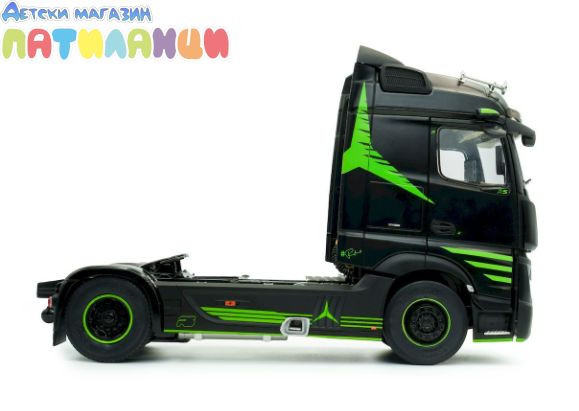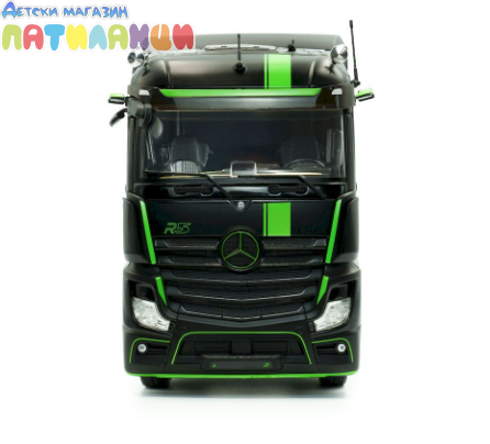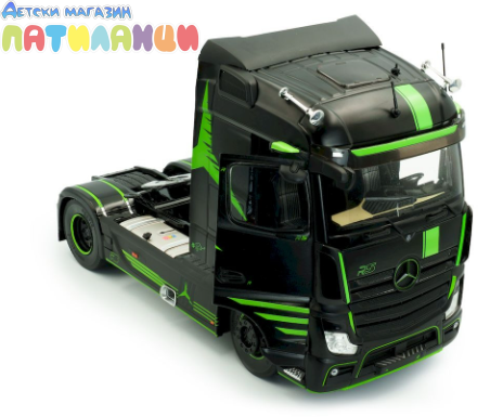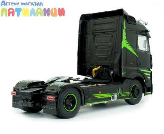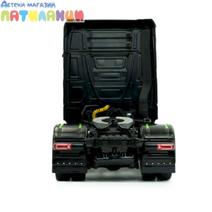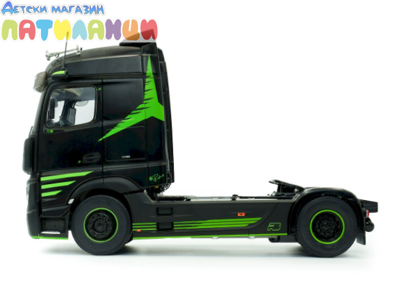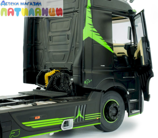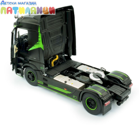 Миниатюрата е изработена от метал (die-cast) с висококачествени пластмасови детайли и впечатлява с реалистична кабина, прецизно изработено шаси и детайлен интериор. Елегантният черен цвят подчертава стилната визия на модела и го прави отличен избор за колекционери и фенове на камиони.