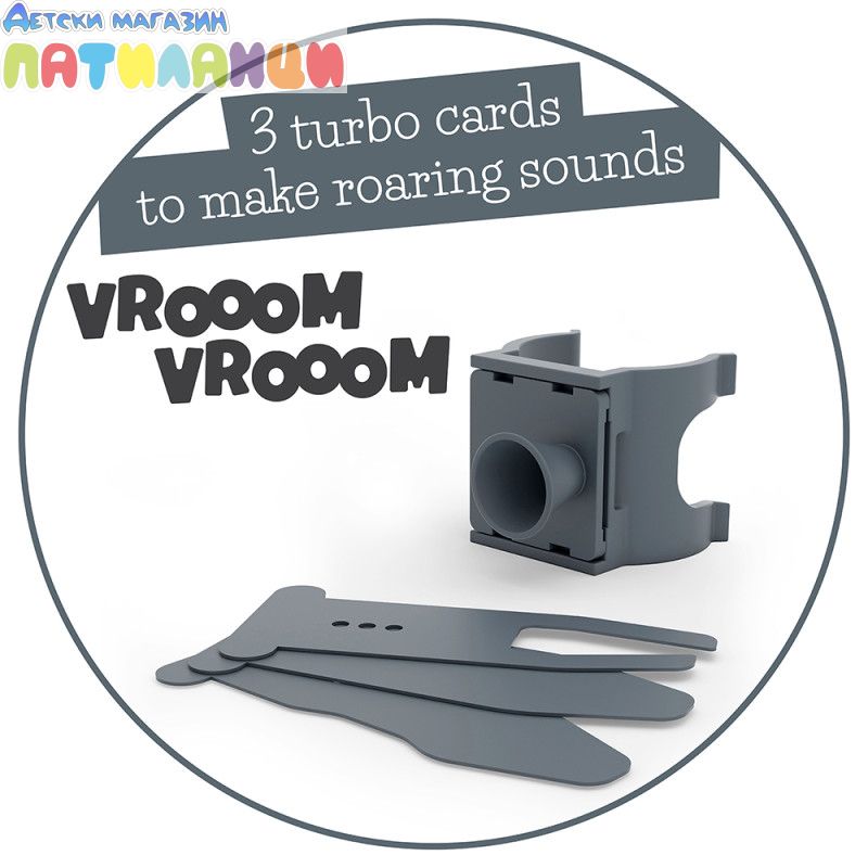 Само ппоставете Turbo Cards, за да издавате истински звуци на мотор, докато карате! БРЪМ, БРъЪММ! 3-те включени турбо карти издават ревящи звуци на предната вилка - БРЪМ, БРъЪММ! Турбо картите имат различни настройки за регулиране на нивото на звука.