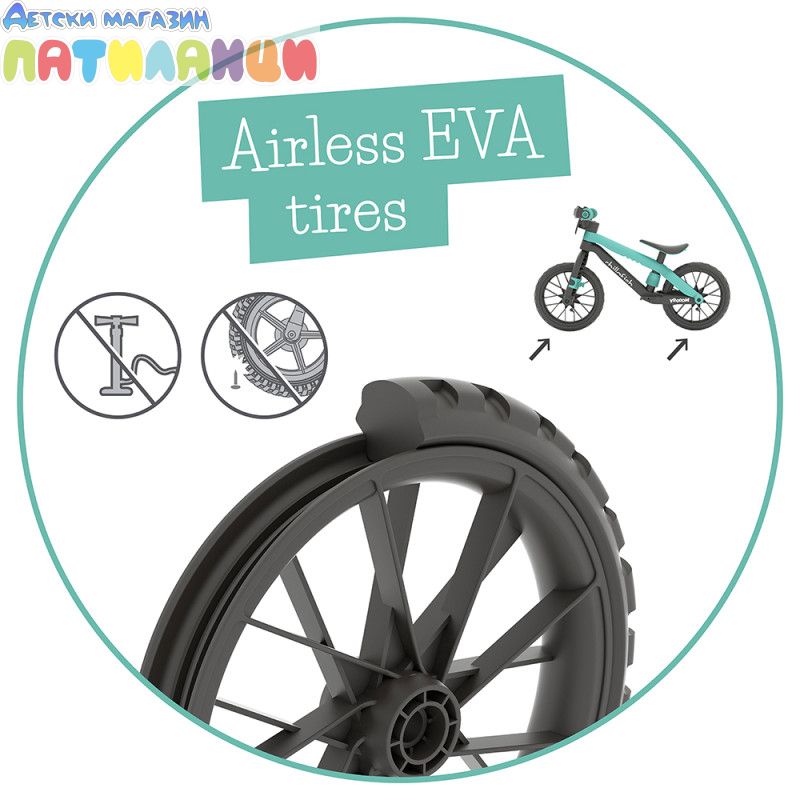 Безвъздушните EVA гуми ви осигуряват най-голям комфорт: вече дори не е необходимо да ги помпате. Без риск от пробиване, от сега нататък само забавление!