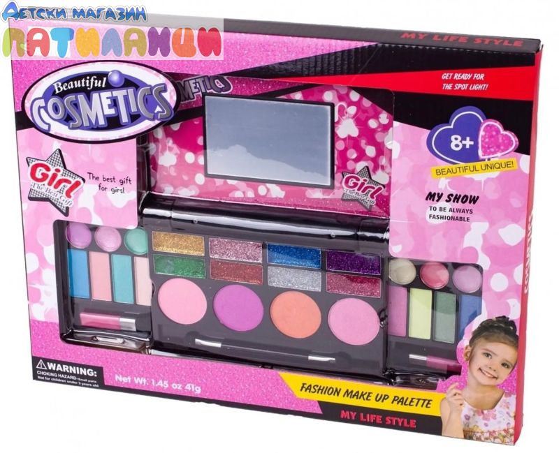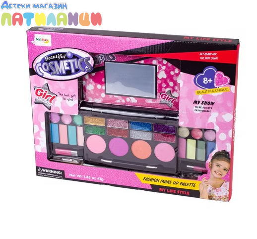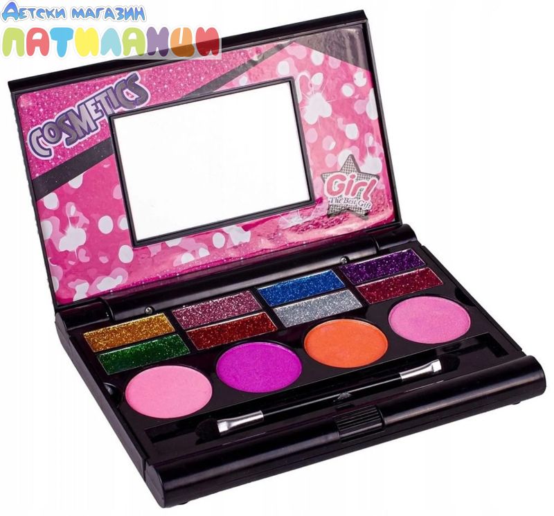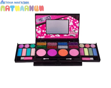 Комплект за момичета, благодарение на който могат сами да си направят първия грим. Всеки малък фен на тунинга ще бъде изключително доволен от такъв комплект. Чудесен подарък за рожден ден, празник и др. за всяка малка дама. Блестящо огледало с две чекмеджета за аксесоари ще ви отведе в един вълшебен свят. Комплект козметика, за да се превърнете в истински гримьор и да създадете бляскава визия. Комплектът включва много козметика, като сенки за очи, гланц за устни, както и четки и апликатори за нанасяне на грим. Всички козметични продукти, включени в комплекта, са сертифицирани и безопасни за кожата, лесно се отмиват с вода и не предизвикват алергии. Красивият комплект съдържа всичко, от което се нуждае една малка принцеса, за да блести. СЪСТАВ НА КОМПЛЕКТА: - 1 огледалце - 14 сенки на прах - 8 гел сенки за очи с брокат - 4 ружа - 2 четки Размери на сгънатата палитра: 17,5 x 14,0 x 2,0 см Размери на разгънатата палитра: 32,0 x 14,0 x 9,5 см Размери на опаковката: 36,0 x 3,0 x 28,0 см