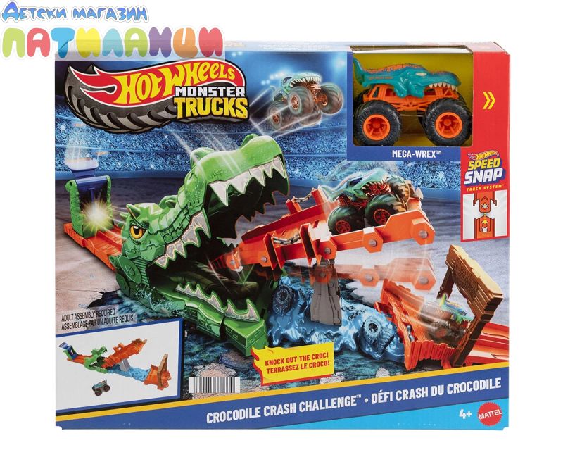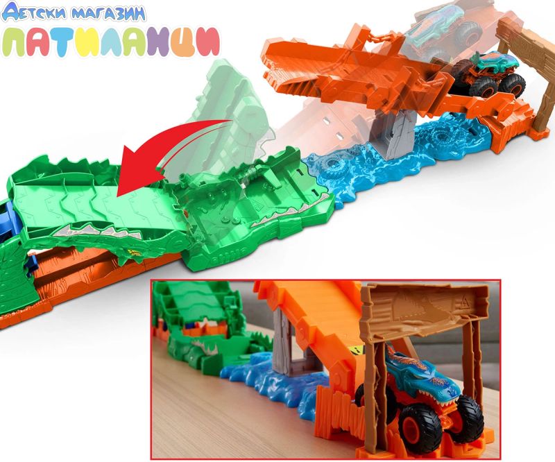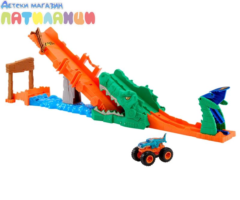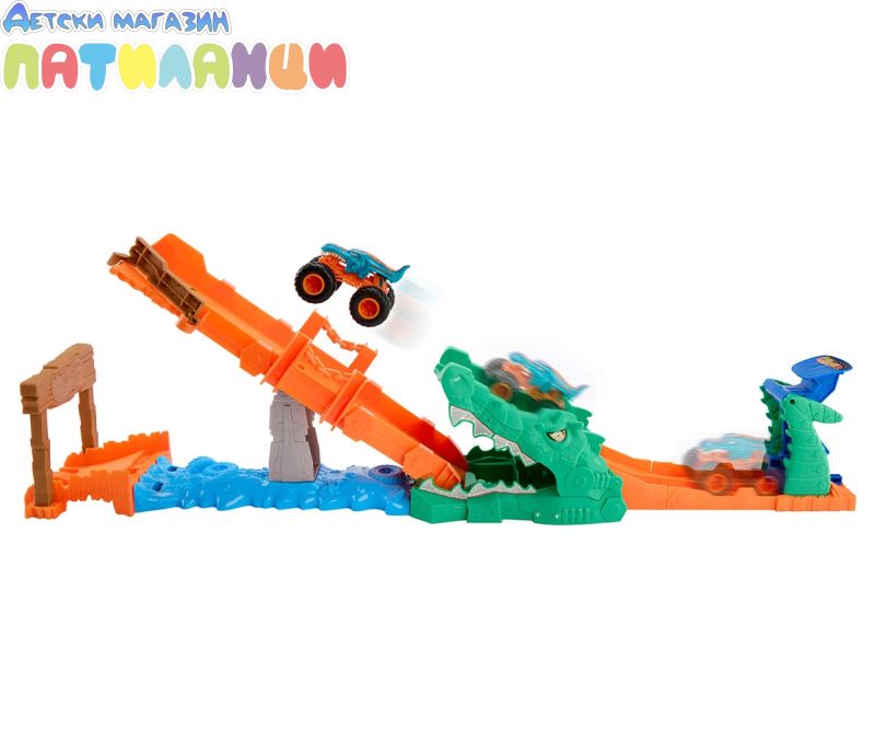 Преминете през „блатото“ и избягайте от гладния крокодил с този вълнуващ комплект Hot Wheels Monster Trucks;