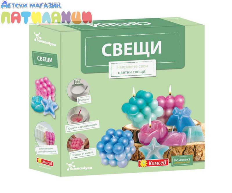 С този комплект за изработка на ароматни свещи можете да създадете впечатляващи свещи с приятен аромат и различни форми, включително модерната форма „bubble cube“. Комплектът включва всичко необходимо, за да създадеш свои собствени свещи - независимо дали за декорация, ароматизиране на дома или за създаване на уютна атмосфера в стаята. Направете своите цветни свещи! Разтопи! Оцвети и ароматизирай! Извади от калъпа! Открий нов комплект за изработка на ръчни свещи от Science4you! Този комплект е идеален за всеки, който иска да създаде персонализирани и ароматни свещи. Смесвай и комбинирай различни цветове, добавяй релаксиращи аромати и създай свои собствени свещи, с които да декорираш дома си или да ги подариш на близки. Перфектен за творчески моменти със семейството, този комплект съчетава забавление и обучение, като помага да развиете творчески и артистични си умения. Включва всички необходими материали и инструкции, за да създадеш свещи лесно и безопасно.