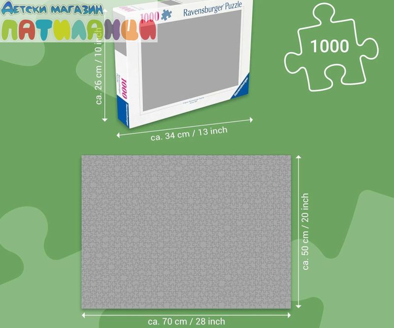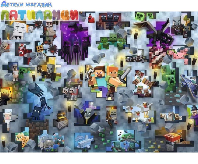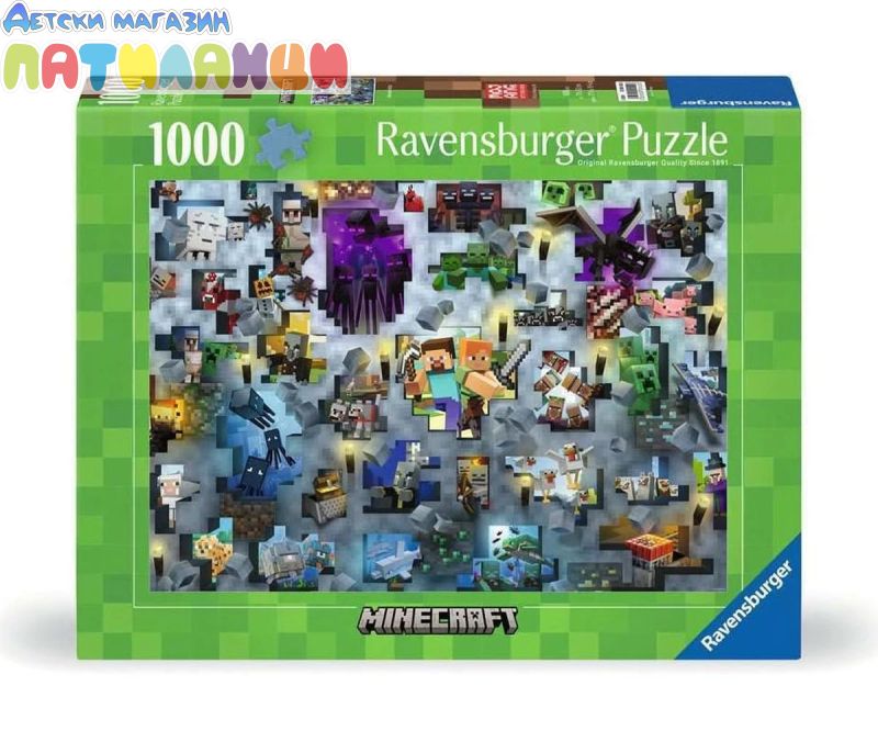 Хващайте инструментите — време е да изпитате строителните си умения с този пъзел „Minecraft Challenge“! Ще ви трябва диамантена кирка на този път, защото този пъзел може да се окаже по-труден от изграждането на цял град — или не! Пробивавайки през бариерата, Стив и Алекс са на преден план, готови за битка. Тук ще хотели и селяни, паяци и овце, гъски и фантоми, ендърмени и ендър дракон, зомби и някои калмари, костенурки със светеща кожа, вещица, вълци и още! Светът на Minecraft и този предизвикателен пъзел са вашите за създаване! Ravensburger Puzzles означава забавление с пъзели с първокласно качество. За начинаещи, напреднали потребители или професионалисти - има правилен брой части и правилен мотив за всеки любител на пъзелите. Части от пъзел, характерни и уникални благодарение на ръчно изработени инструменти за пробиване, десетилетия опит в производството на пъзели и високи стандарти за качество карат сърцата на пъзелистите да бият по-бързо. Пъзелите Ravensburger от 1000 части са изработени с първокласно качество и са с размери 70 x 50 см, когато са готови. Идеален за възрастни и за деца над 14 години. Изработени са от изключително дебел картон, комбиниран с фина, ленена структурирана хартия, за да създадат изображение без отблясъци и да осигурят възможно най-доброто изживяване. От забавно прекарано време заедно със семейството, до пълен релакс след напрегнат ден, има толкова много положителни неща в реденото на пъзелите. Това е подкрепено от десетилетия опит в производството на пъзели и високи стандарти за качество на материал, мотив и дизайн. Уникалността на характерните части от пъзела се постига чрез ръчно изработени инструменти за щамповане, които се произвеждат с най-голяма часовникарска прецизност в Равенсбург в Горна Швабия. Тази страст към качеството, вниманието към детайла и огромната селекция от мотиви правят пъзелите Ravensburger толкова уникални и гарантират незабравимо изживяване.