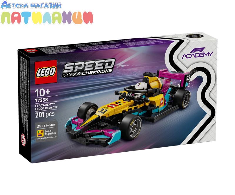 През 2026 г. LEGO® Group се присъединява към решетката на F1 ACADEMY™ за първи път със своя собствена кола от F1 ACADEMY, момичетата и момчетата на възраст над 10 години могат да построят свой собствен модел за показване. Тази състезателна кола LEGO® Speed Champions F1 ACADEMY LEGO® (77258) е идеална за игра и се показва и включва много от същите детайли от модела, използван във F1 ACADEMY – изцяло женската състезателна серия. Тази кола от F1 ACADEMY има кабина, задно крило и гуми, на които е отпечатано „Pirelli“. Играчката състезателно кола включва още 1 минифигура на пилот от F1 ACADEMY, която се предоставя с шлем, перука и гаечен ключ, за да могат децата да я поставят в кабината за високоскоростни състезателни екзюни. Строителните комплекти LEGO Speed Champions са чудесен подарък за деца и фенове на автомобили, които могат да сглобяват реплики на разширената гама емблематични превозни средства. Можете да създадете всеки модел на състезателна кола с увереност, като използвате приложението LEGO® Builder – да промените формата, да завъртите в 3D и да проследите напредъка си с лесни за следващи дигитални инструкции. Комплектът съдържа 201 части.