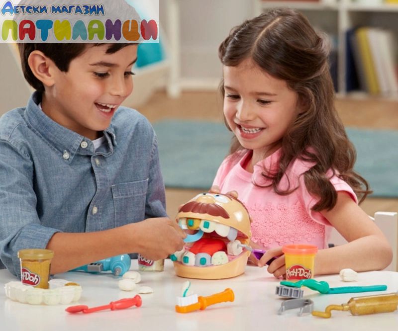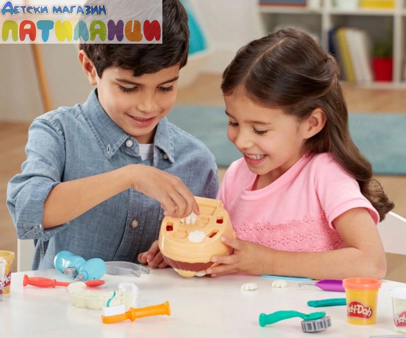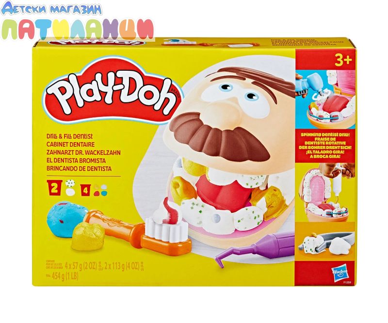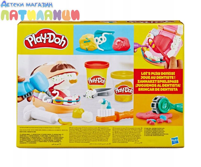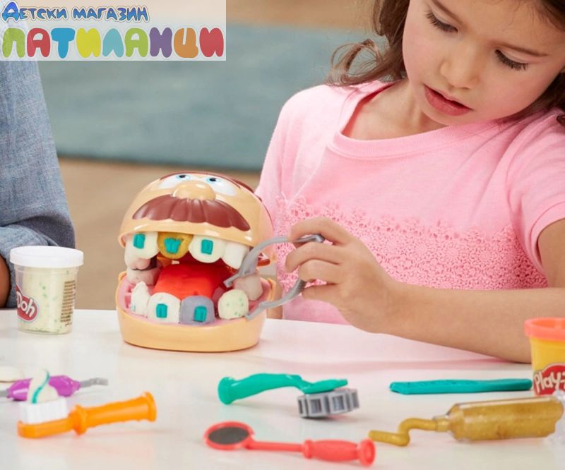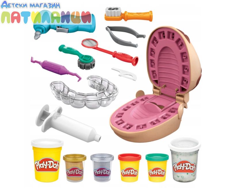 Doctor Drill 'n Fill се завръща с повече готовност от всякога! Със сместа злато и сребро за брекети и пломби и нова въртяща се тренировъчна платформа без батерии, зъболекарят стана още по-добър. Преработихме формата за зъби, за да направим цял ред зъби наведнъж и се предлага с всички класически зъболекарски инструменти за забавна ролева игра. Докторе, упражнявайте се и помогнете на пациента преди да го заболи зъб! Дори да е малко страшно да отидете на зъболекар, децата могат да поемат контрола и да играят неговата роля с този Play-Doh комплект за игра. Те могат да накарат пациента да изплези езика си Play-Doh, след което да използва формата, за да създадат цял ред зъби Play-Doh наведнъж. Започнете да пробивате и пълните с ръчно задвижваната машинка. Моделиращата смес има зелени петна, за да изглежда, че пациентът има кариес в зъбите си, а златните и сребърните цветове Play-Doh правят страхотни скоби и пломби. С общо 10 стоматологични инструмента и 8 нетоксични кутии с пластелин Play-Doh, този комплект зъболекар е страхотно занимание за деца на 3 и повече години!