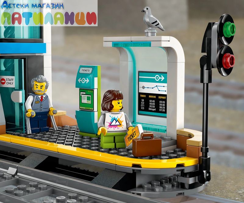Феновете на моделите на влакове ще харесат този комплект с централна гара с мотриса за поддръжка, 6 минифигурки, фигурка на бебе и 2 фигурки на гълъб.
