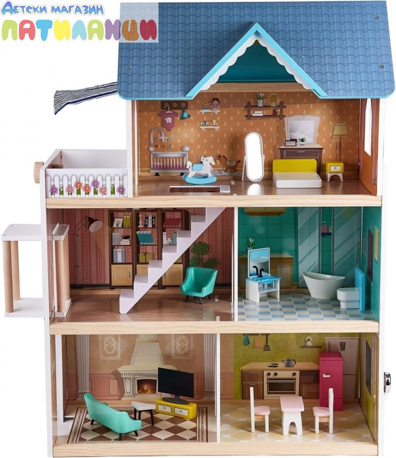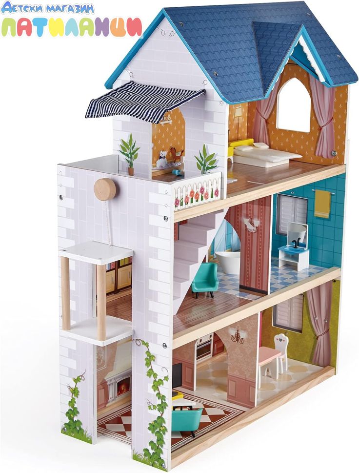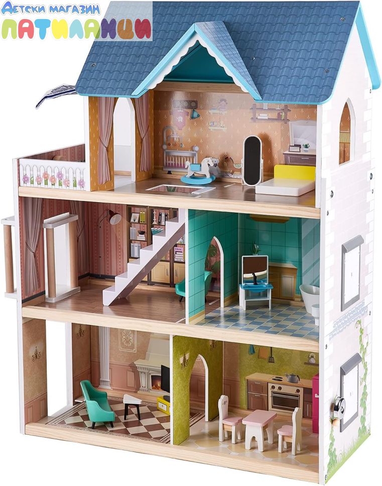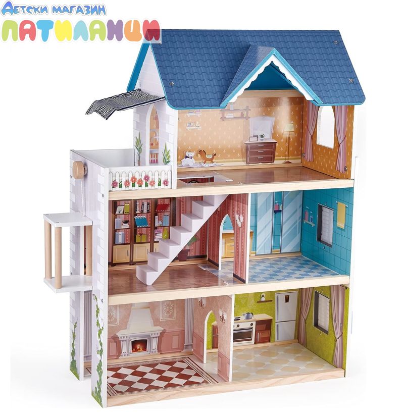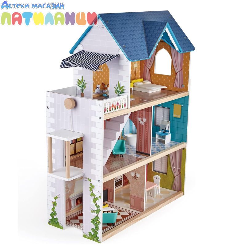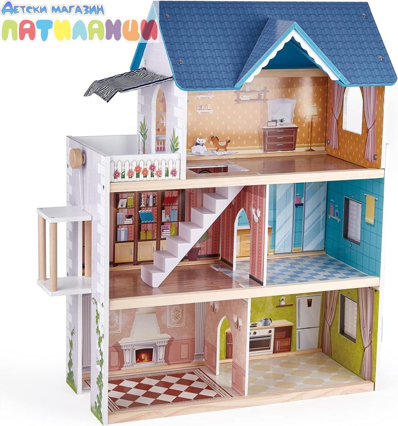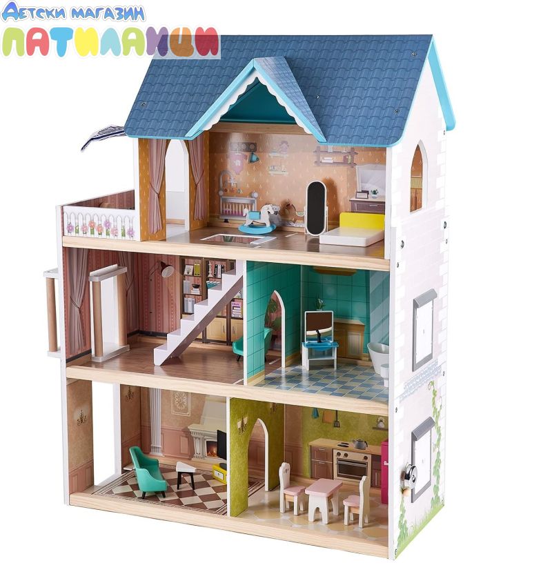Къщата е изработена от висококачествено дърво и безопасни материали, което я прави устойчива и подходяща за дълготрайна употреба. Просторните стаи и отвореният дизайн позволяват лесен достъп и удобна игра от всички страни.