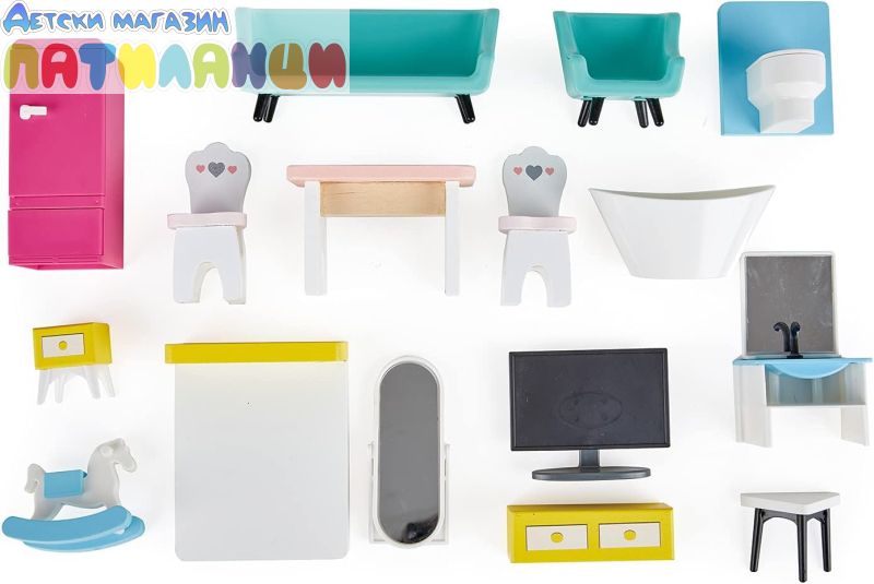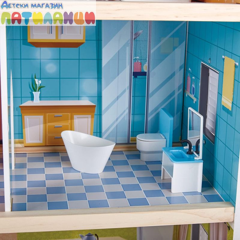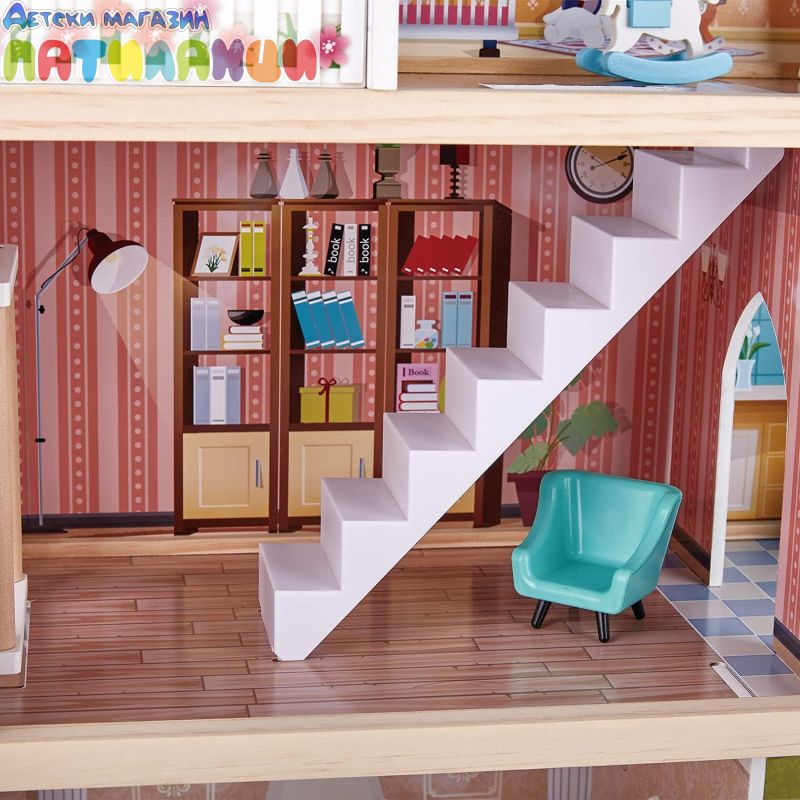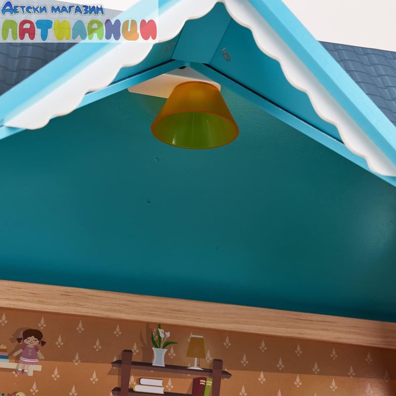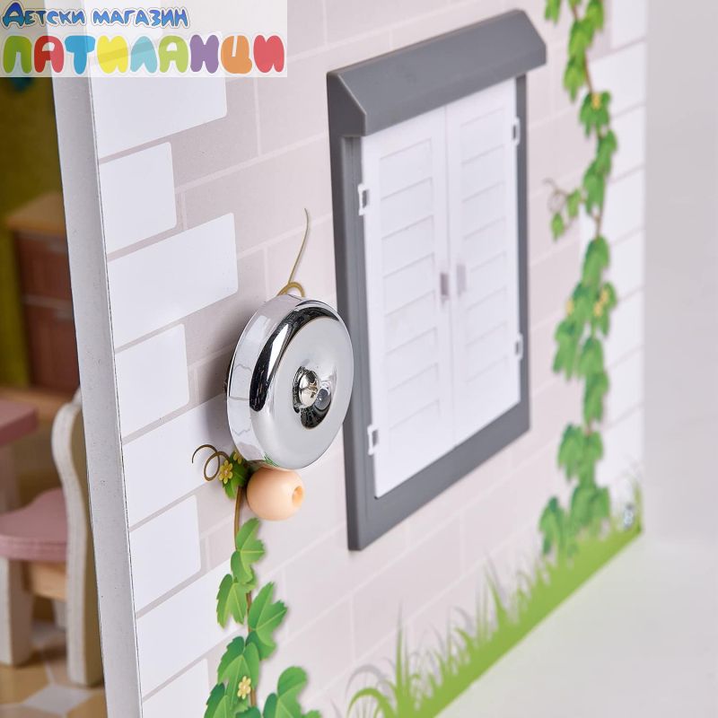 Повечето деца мечтаят за собствена къща за кукли, а тази прекрасна къща за кукли, оборудвана с подвижни лампи и звънец, е максимално реалистична. Включва мебели за баня, спалня и хол за безкрайни възможности за оформление. Асансьорът се движи нагоре и надолу, така че куклите могат лесно да пътуват от стая в стая. Прозорците могат да се отварят или затварят за лягане или лошо време. Звънецът на вратата предупреждава вашето семейство за пристигането на гости. Светлината на тавана се включва, така че играта до късно не е нужно да свършва.