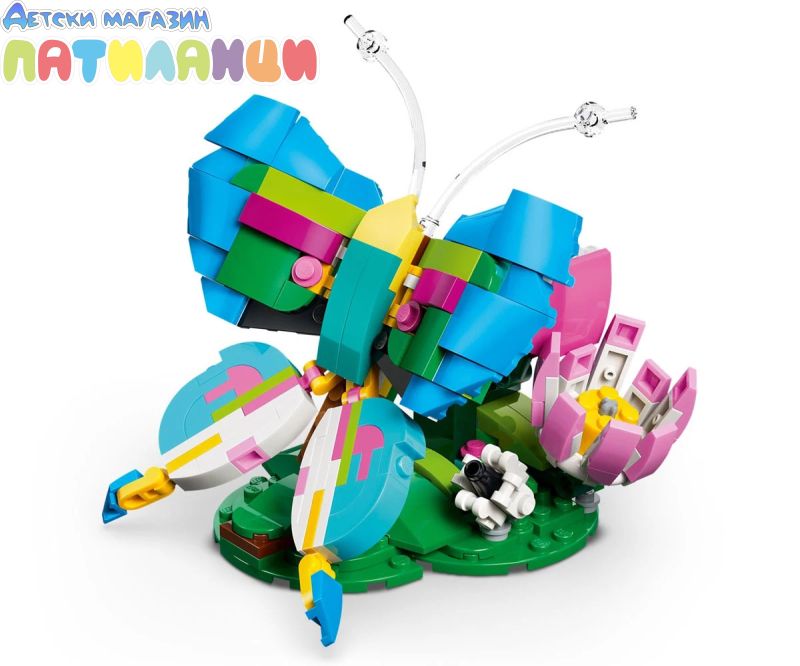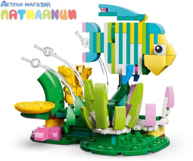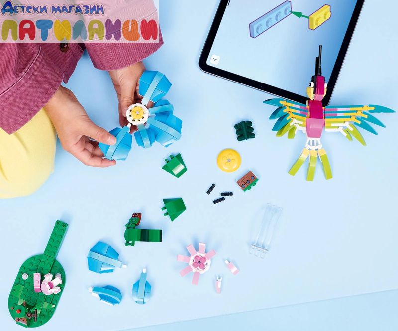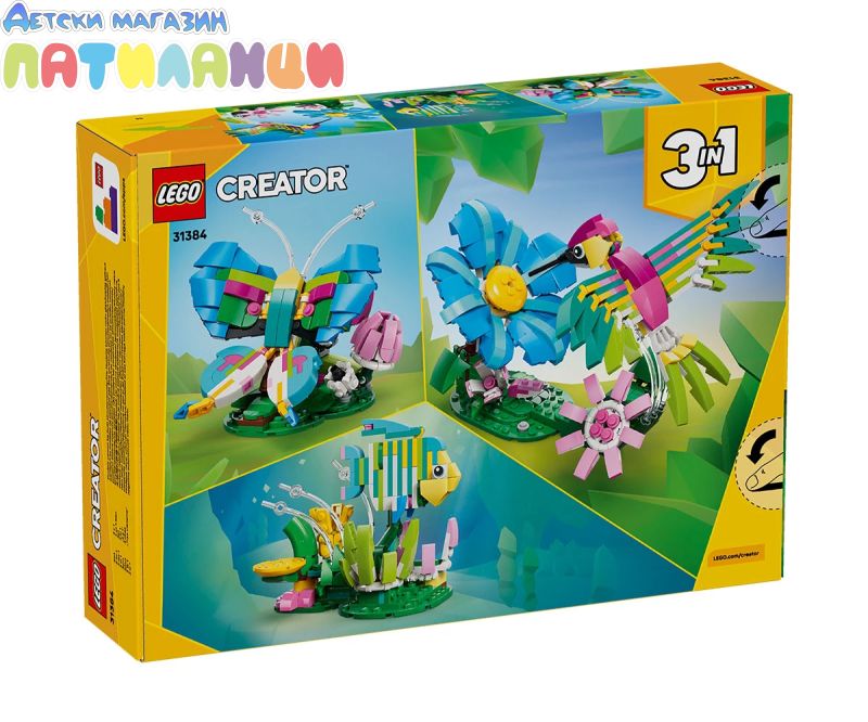 Момичетата и момчето на възраст над 8 години могат да разиграват очарователни истории с играчката за построяване на LEGO® Creator 3 в 1 Диви животни: цветно колибри (31384). Този впечатляващ комплект с фигури на животни предлага на децата 3 различни възможности за построяване с един и същ комплект тухлички. Те могат да изберат да построят подвижно колибри в динамична летяща поза на стойка с красиви цветя. След това можете да го превърнете в пеперуда на стойка с цветя, или в тропическа риба на стойка с подводни растения. След като строителството и забавлението при игра включва, всяко животно-играчка може да бъде гордо изложено като красива част от естествената украса. Този комплект LEGO Creator „3 в 1“ ще вдъхнови младото въображение и е чудесна идея за подарък за деца, които обичат природата и великолепните животни. Децата може да построи всеки комплект уверено с приложението LEGO Builder – да сбърка, да завърти в 3D и да проследи напредъка с лесни за следващи цифрови инструкции. Моделите не могат да бъдат построени едновременно. Конструирайте, покажете и се наслаждавайте на забавни истории с тези 3 красиви животни LEGO®! Възхищавайте се на зашеметяващо колибри, което се рее във въздуха и пие нектар от цвета. След това го превключете в разкошна пеперуда на стойка с цветя, или в цветна тропическа риба на стойка с подводни растения. Какво ще построите? Изборът е вашият с този прекрасен комплект за игра „3 в 1“ с фигури на животни.