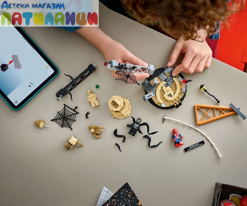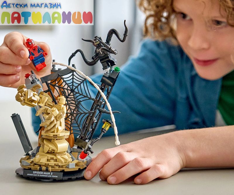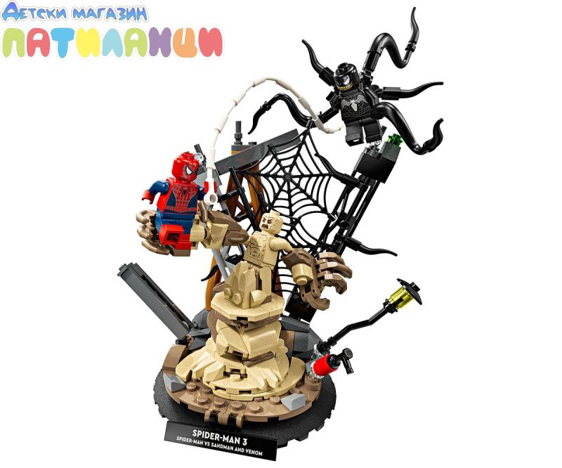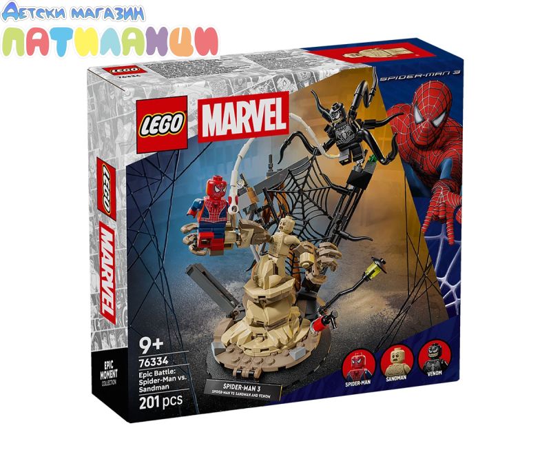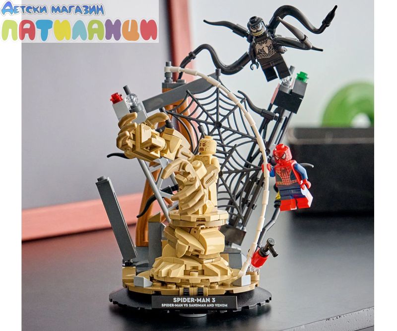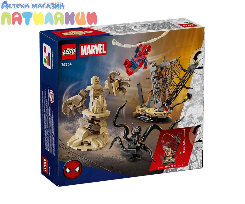 Вдъхнете живота на филма Спайдърмен 3 на Marvel Studios със строителния комплект LEGO® ǀ Marvel Епична битка: Спайдърмен срещу Пясъчния човек (76334) за деца, момчета и момичета на възраст над 9 години. Включени са 3 емблематични минифигури – Спайдърмен, Венъм и Пясъчния човек – за епични ролеви приключения и страховити възможности за показване. В комплекта за конструиране има страховити герои от филма и много интерактивни елементи: Спайдърмен се спуска от кран на въже от паяжина; Пясъчният човек се изправя от развалините със всяка голяма ръка; а Венъм напада с 4 подвижни пипала. Децата могат да изложат модел LEGO като украса на стаята върху стабилната основа и табелка с името или да отделят минифигурите, за да създадат собствените си истории за играта. Този комплект е чудесна идея за подарък за рожден ден на малки супергерои, конструктори с LEGO и фенове на продукти от Спайдърмен. А с приложението LEGO Builder децата могат да строят уверено – да компютърират, да завъртат в 3D и да проследяват напредъка с лесни за следващи цифрови инструкции. Отдайте се на ексшън с приключение за конструиране от Спайдърмен 3 на Marvel Studios! Когато Пясъчният човек се изправи от развалините, Спайдърмен се втурва на въже от паяжина, за да го спре. Но момент – Венъм също е тук, със страховитите си пипала, готови за удар! Какво ще стане след това? Можете да покажете екшън модел в стаята си или да вземете мини фигурки за приключения със супергерои.