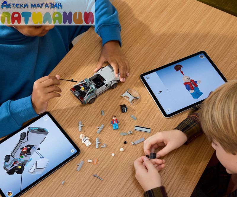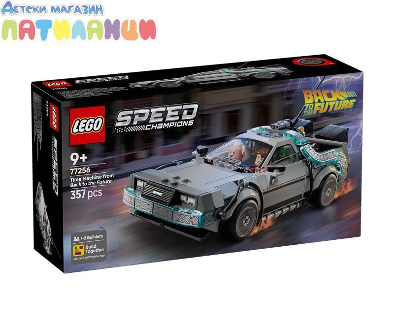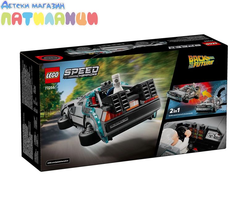 LEGO® Speed Champions Машина за времето от „Завръщане в бъдещето“ (77256) – комплектът на модела на колата позволява на деца на възраст над 9 години да построят, покажат и пресъздадат екшън от емблематичната филмова поредица. Тази кола-играчка от тухлички включва много от известните детайли на модела, показан в популярните филми. Постройте тази емблематична кола с гръмоотвода и калифорнийската регистрационна таблица от първия филм, преди да я включите в годишната версия от втория филм с уредбата Mr. Fusion, оранжевата регистрационна таблица и страничното колело. И двете версии имат задни отвори за въздух, кабина, кондензатор на енергия и калкулатор на времето. За допълнителна стойност за игралния комплект се предлагат и 2 минифигурки от филмите: Док Браун и Марти Макфлай, които да бъдат добавени в кабината. Страхотен подарък за деца и носталгични възрастни, които могат да построят всеки комплект с увереност, използвайки приложението LEGO Builder, което им помага да компютъризирате, да завъртите в 3D и да проследявате напредъка си с лесни за следващите дигитални инструкции. Върнете се в бъдещето с този модел на кола от емблематичните филми! Тази машина на времето от „Завръщане в бъдещето“ има 2 възможности за построяване: едната включва гръмоотвода от първия филм, или може да бъде построена в режим на летене с уреда Mr. Fusion и страничните колела от втория филм. Комплектът за игра включва и 2 минифигурки: Марти Макфлай и Док Браун, които да бъдат добавени в кабината за забавни приключения.