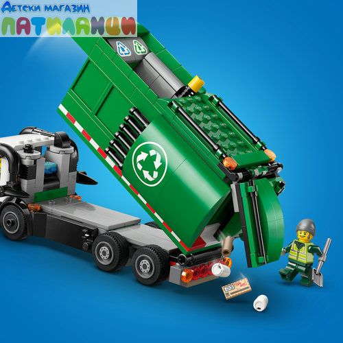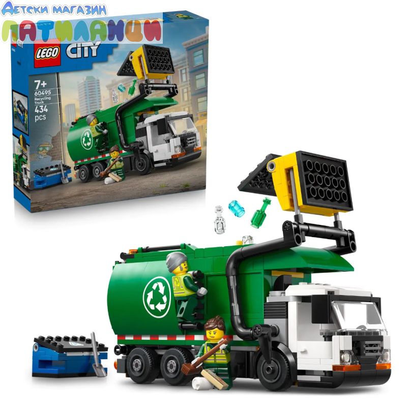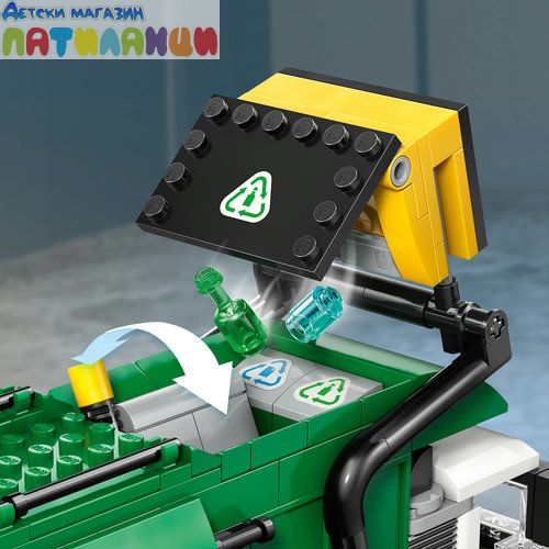 Този комплект за конструиране LEGO® City Камион за рециклиране (60495) е пълен с реалистични детайли за въображаема игра. Камионът-играчка има разделител за сортиране на стъклените и хартиените елементи LEGO, както и щипки за съхранение на инструменти и детайлна шофьорска кабина. Децата могат да накланят кабината, за да видят предизвикателния електрически двигател, да натиснат лоста, за да повдигнат и изпразнят двата контейнера за смет в камиона, и да повдигнат контейнера, за да изхвърлят сортираните отпадъци през един от двата задни люка. Просто добавете минифигурките на шофьора и работника и нека приключенията започнат. Този подробен детски комплект за моделиране на камион е чудесен подарък за 7-годишни момчета и момичета, които обичат интерактивни играчки за творческа игра. Добавете го към други комплекти LEGO City (продават се отделно) за още приключения. С този комплект за игра „Камион за рециклиране“ от LEGO децата могат да се наслаждават на интуитивно конструиране с приложението LEGO Builder, да увеличават и въртят с 3D инструкции, като запазват и проследяват напредъка си по време на конструирането - всичко това от приложението.