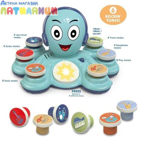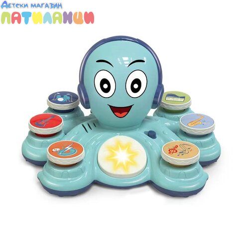 Октоподът разполага с барабани и различни звукови ефекти, които стимулират слуха и насърчават интереса към музиката. Чрез игра детето развива координацията, ритъма и фината моторика.