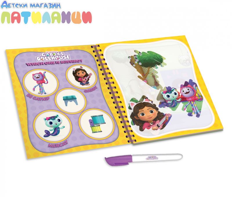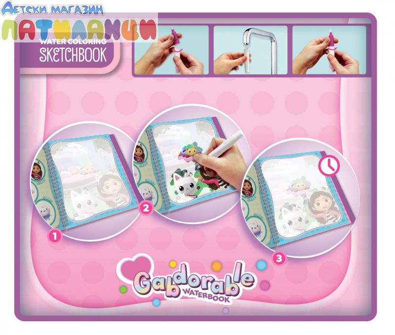 Страниците изглеждат празни, но при намокряне с включения воден химикал се появяват красиви изображения от любимия свят на Gabby’s Dollhouse. След няколко минути рисунките изчезват и книжката може да се използва отново и отново.
