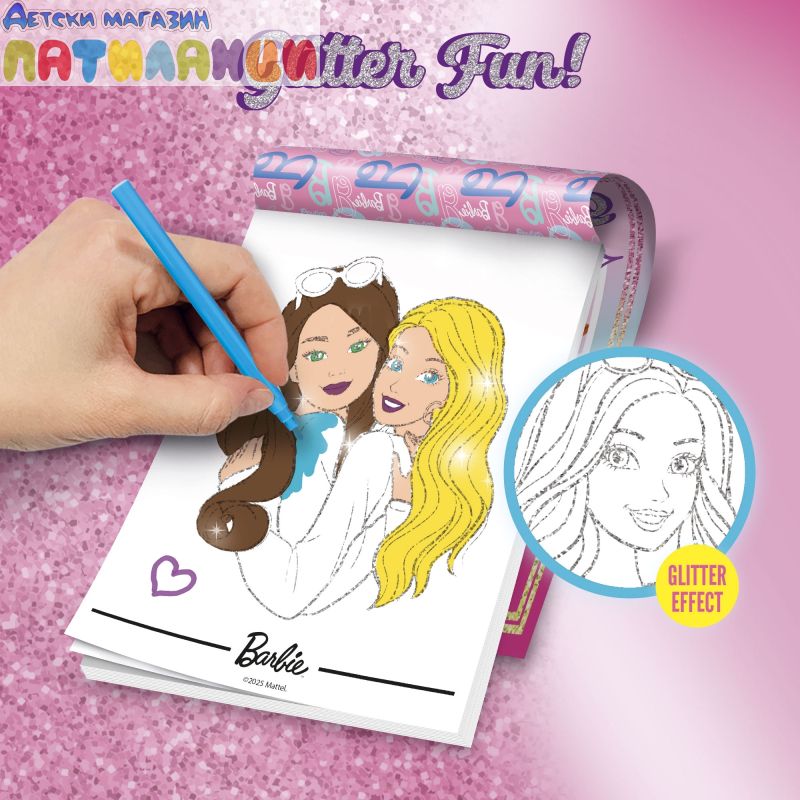 Открийте магията на блясъка с книжката за оцветяване на Барби. Забавлявайте се, оцветявайки всички картинки с блясък вътре.