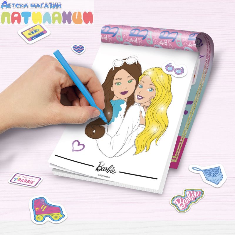 Страниците са украсени с блестящи елементи и стилни илюстрации на Barbie, които оживяват с цветове и сияние. Децата могат да развихрят въображението си, създавайки уникални и цветни визии, докато се забавляват и развиват своите творчески умения.