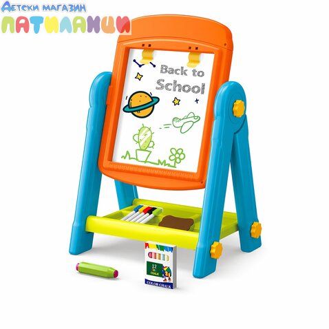 Дъска за рисуване двустранна – практична и забавна дъска, която насърчава творчеството и ученето чрез игра. Двустранният дизайн позволява разнообразни начини на рисуване – с маркери или тебешири, което прави играта още по-интересна и разнообразна.