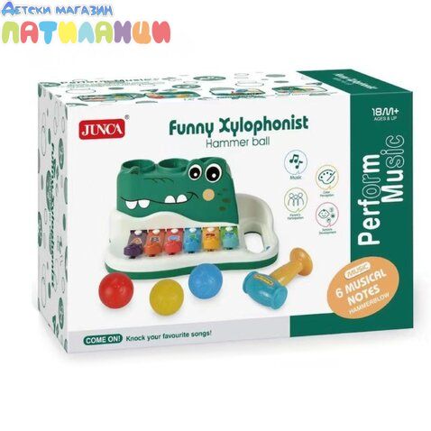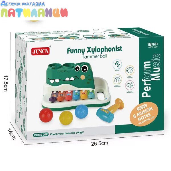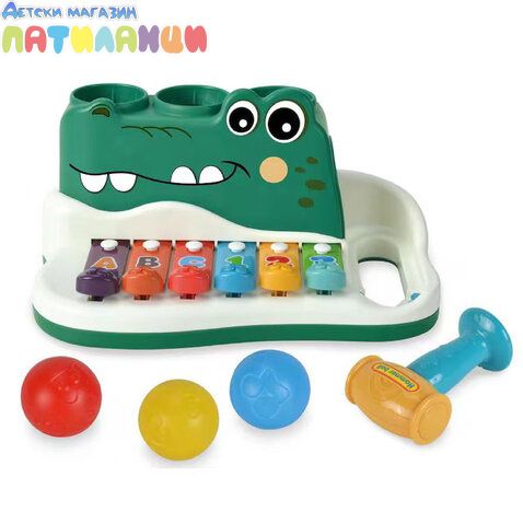 Бебешки ксилофон с топчета Крокодил – забавна и цветна музикална играчка, създадена да развива слуха и координацията на детето. Играчката комбинира ксилофон и игра с топчета, които при удар създават звук.